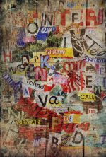 Fototapetul 3D personalizat Woodcut, CMYK, din colecția Rebel Walls, cu litere dispuse aleator, poziționate parcă în relief, oferă senzația de