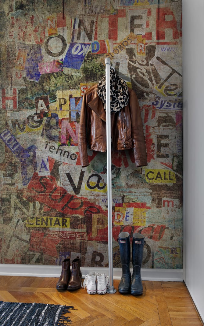 Părți din ziare alcătuiesc un fototapet uimitor, care își lasă amprenta în întreaga cameră.
