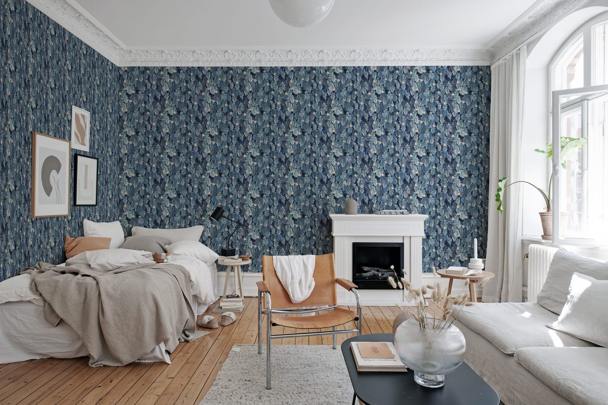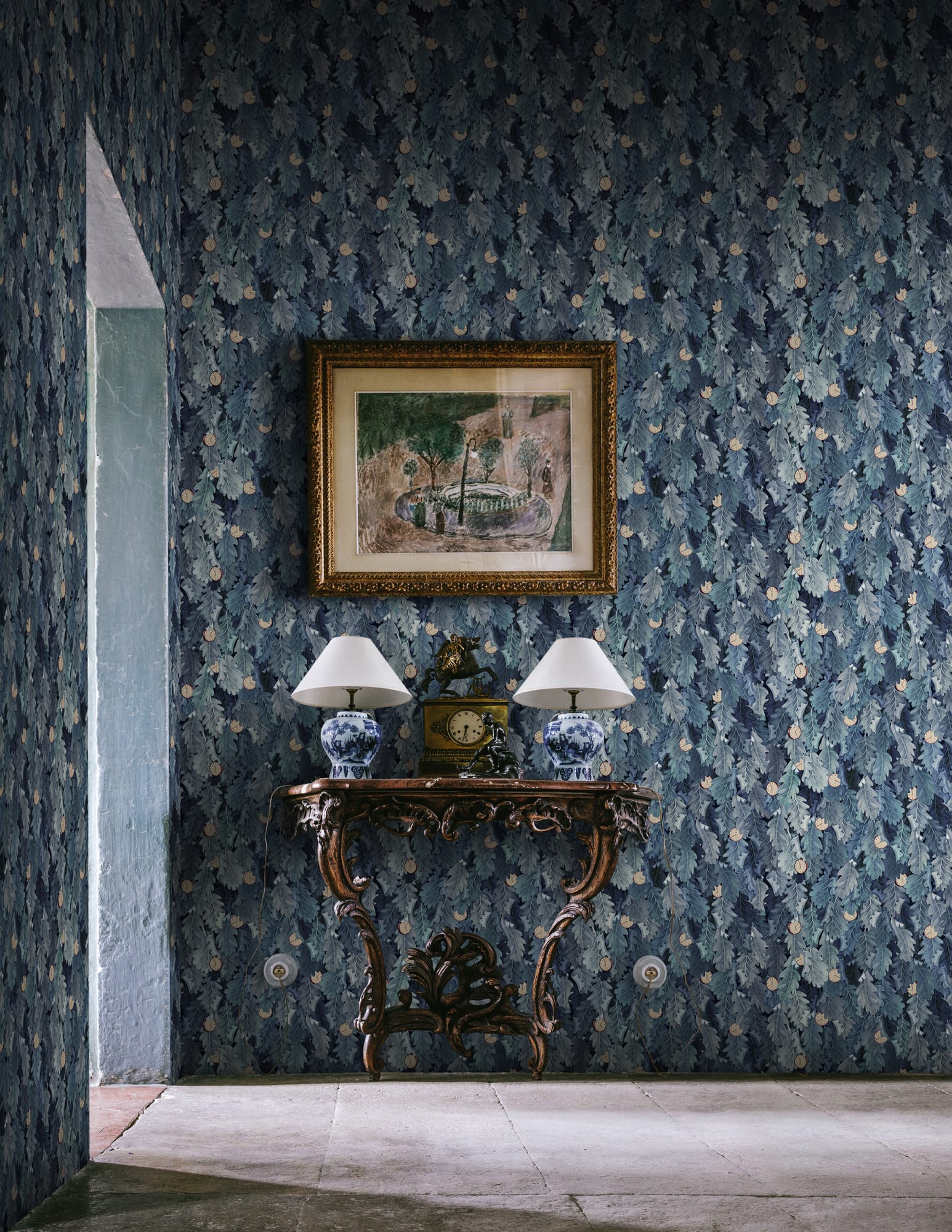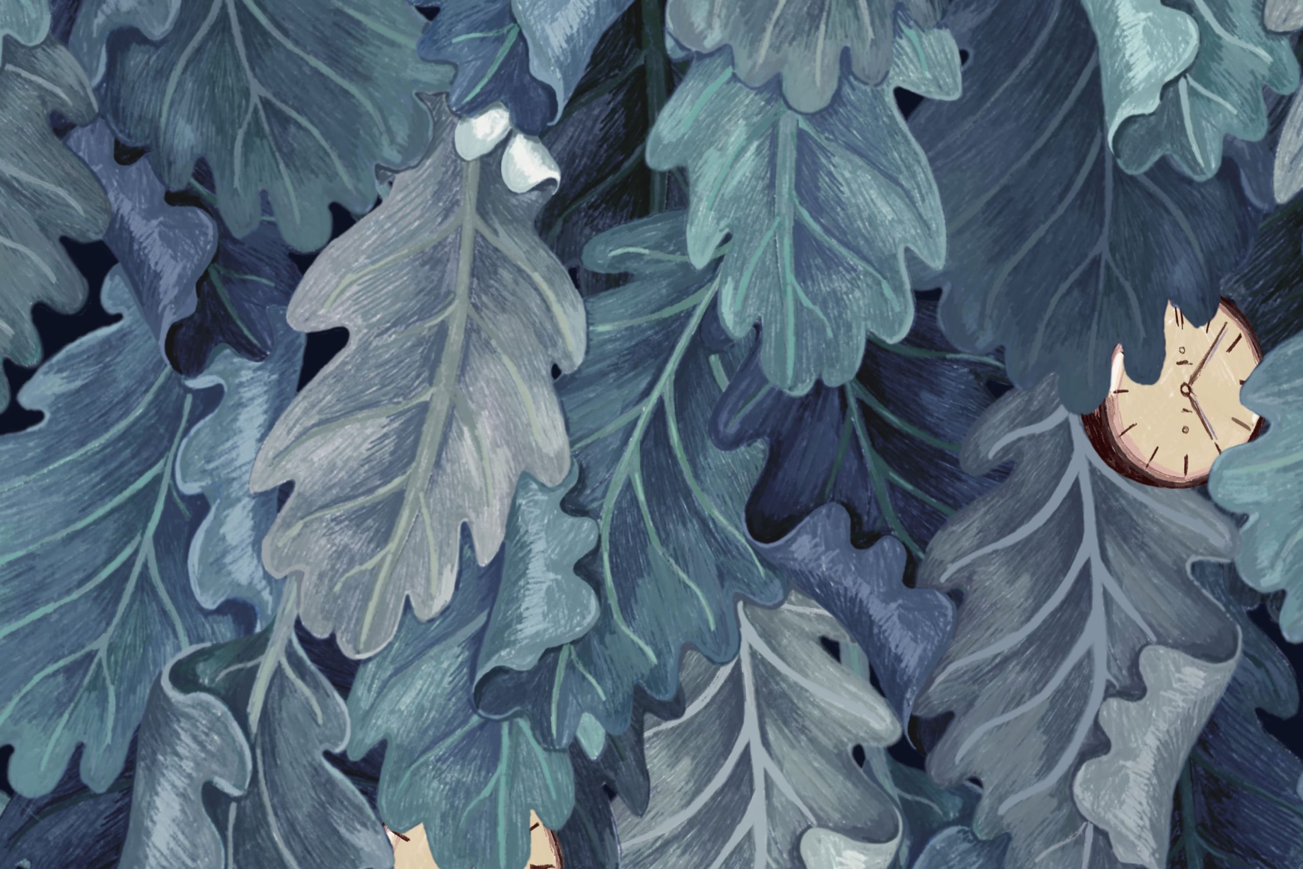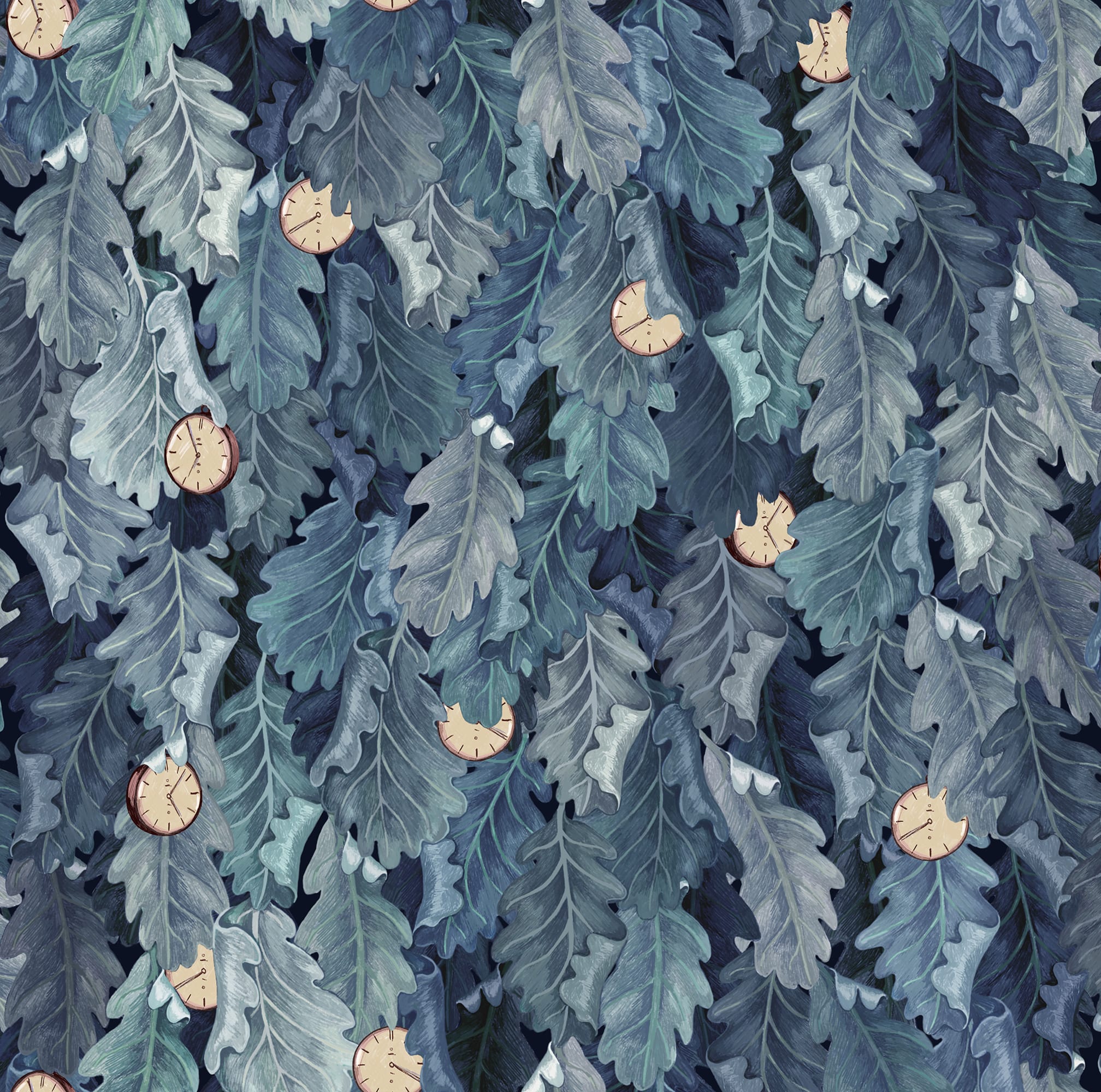 Acest tapet este un fundal minunat și imaginativ. Frunzele de stejar și ceasurile de buzunar au o abordare surprinzătoare. Te întrebi cât este ceasul? Varianta de culoare Blue are atât nuanțe strălucitoare, cât și profunde.