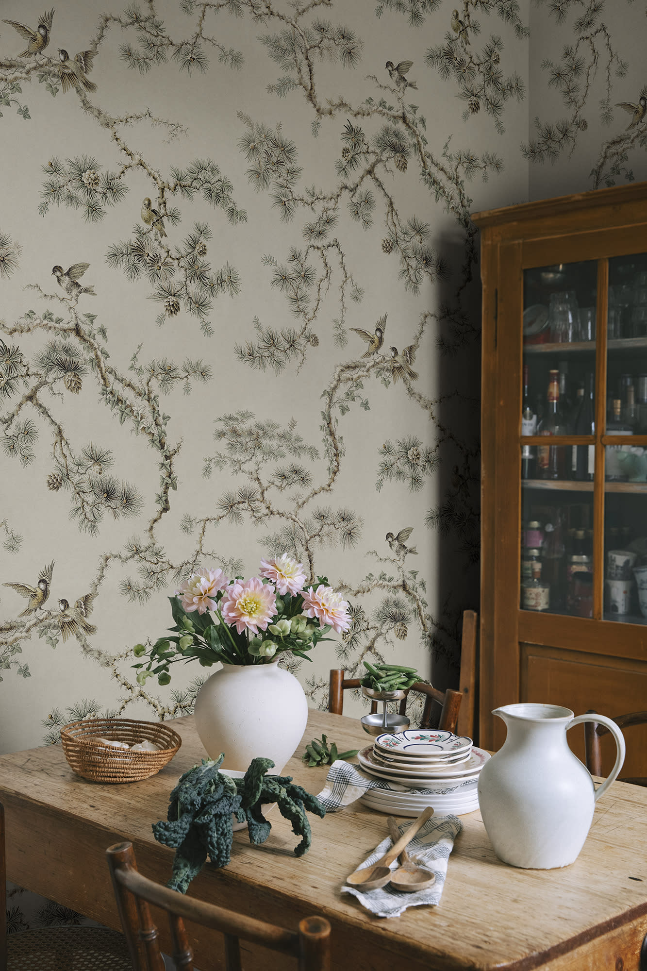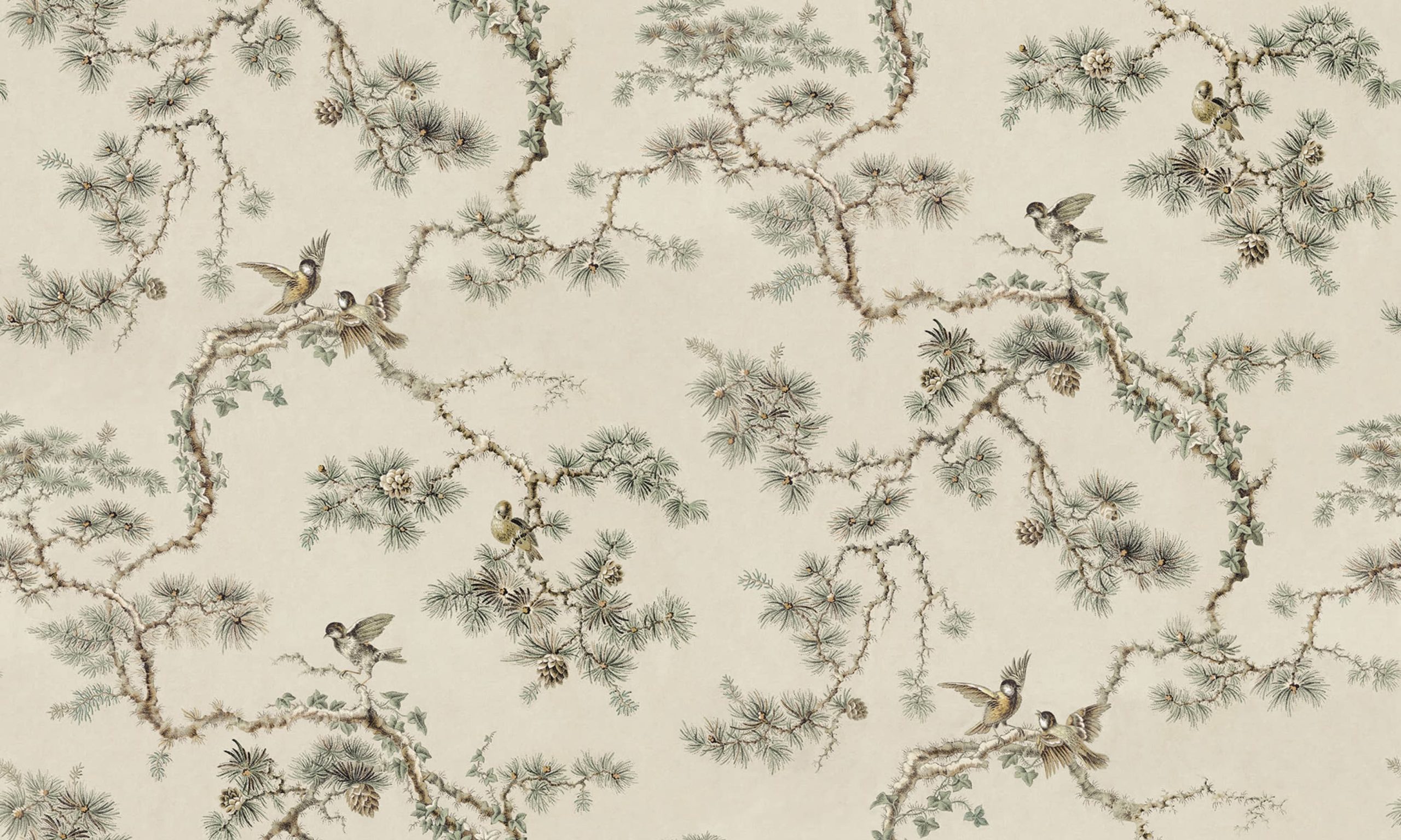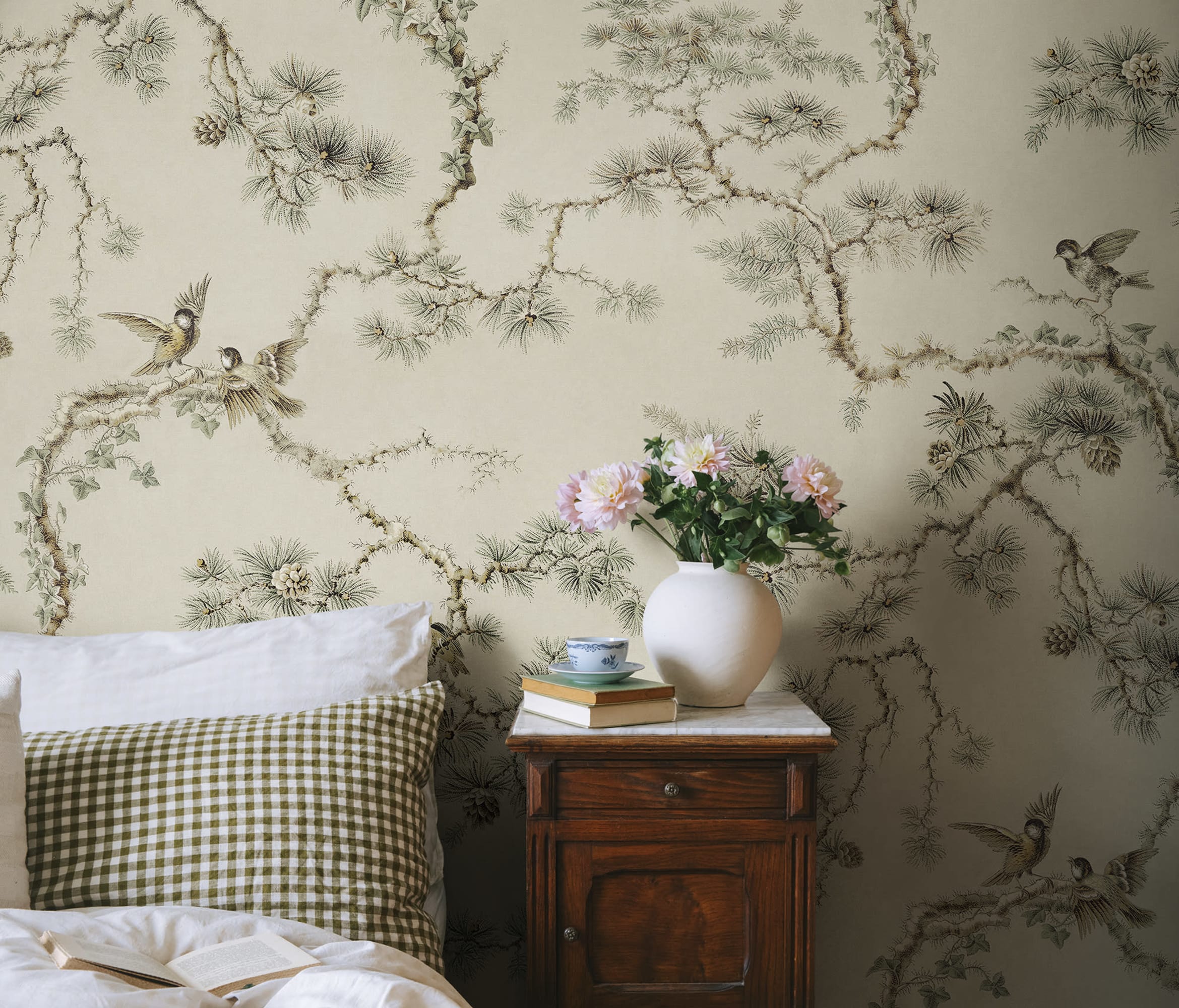 Adaugă un strop de natură și eleganță pereților tăi cu acest tapet mural rafinat. Design cu ramuri de pin și păsări, ideal pentru un decor cald și primitor. Creează o atmosferă relaxantă și sofisticată în locuința ta.