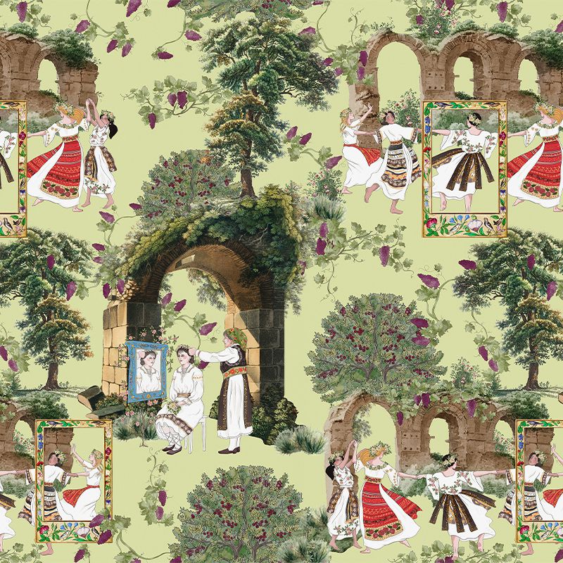 Adaugă un strop de tradiție și culoare casei tale cu Nuntă, VLAdiLA. Acest model unic prezintă o scenă plină de viață a unor dansatori în costume populare, într-un decor verde vibrant. Descoperă farmecul autentic și aducă o notă artistică în orice cameră!