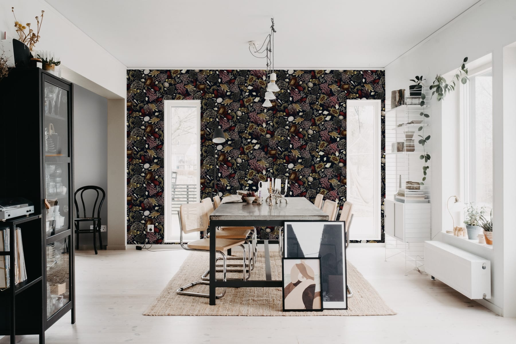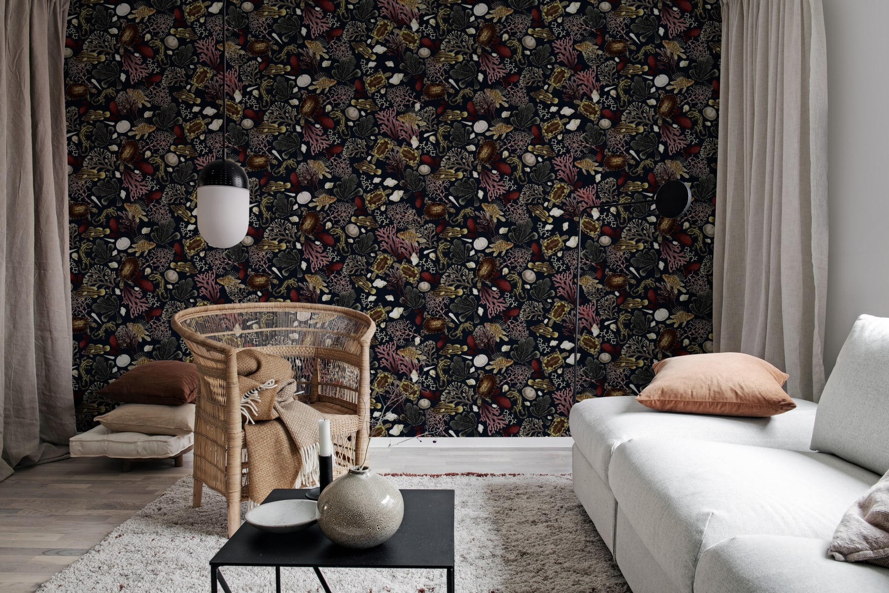 Scufundați-vă într-o lume subacvatică senină cu tapetul nostru Ocean Life, Night. Acest design realizat în mod unic aduce o notă marină chiar în spațiul dvs. de locuit. Designul este plin de ilustrații meticulos detaliate cu țestoase, pești, plante oceanice și o multitudine de alte lucruri pe care le găsiți în adânc. Ocean Life, Night prezintă un fundal întunecat delicat și pașnic, făcându-l foarte colorat.