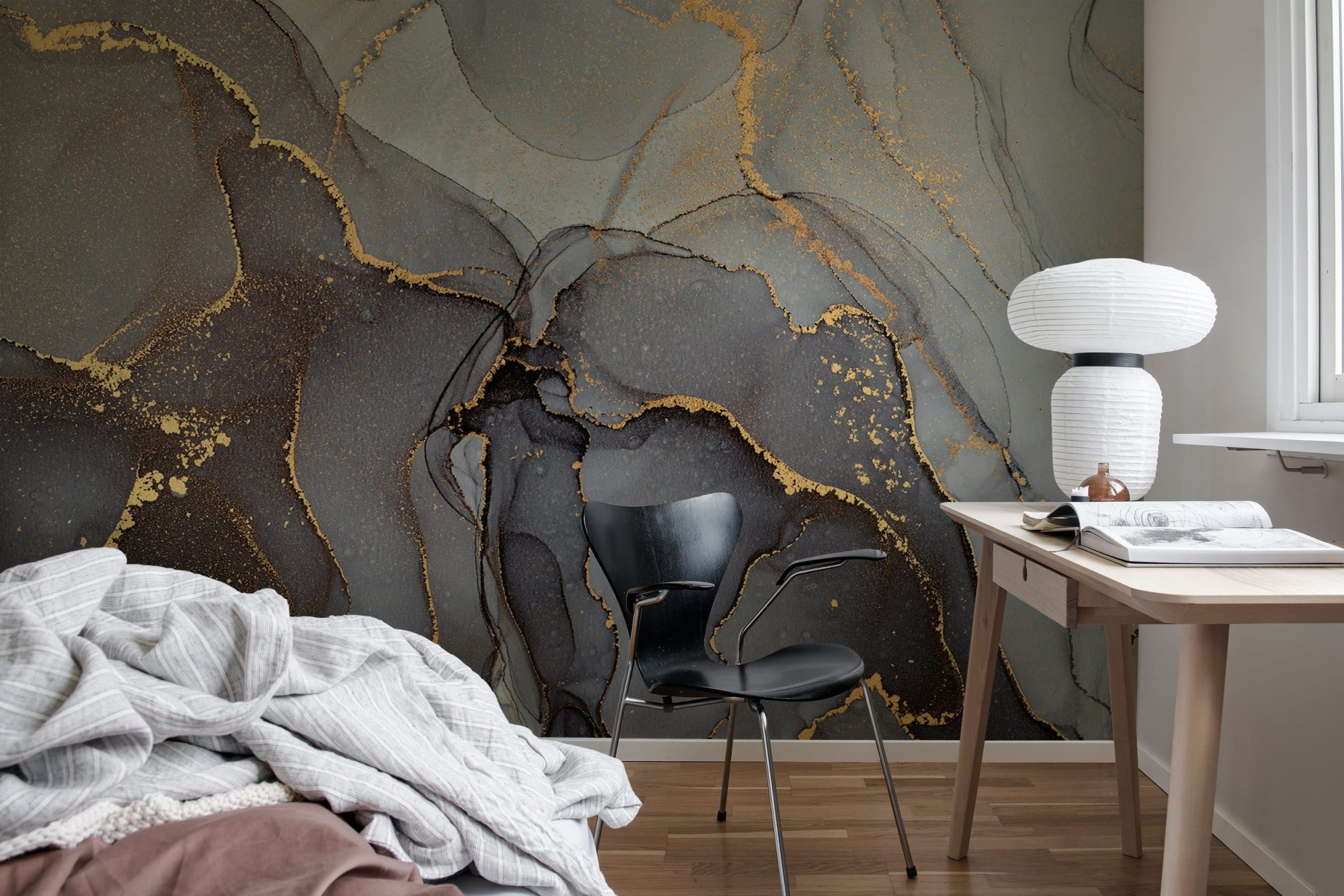 Transformați-vă pereții într-un panou de vis cu tapetul Ony, Black. Acest design tandru și fermecător prezintă o combinație de culori care creează valuri transparente și vârtejuri aurii, evocând o senzație de mister și lux în spațiul dumneavoastră.