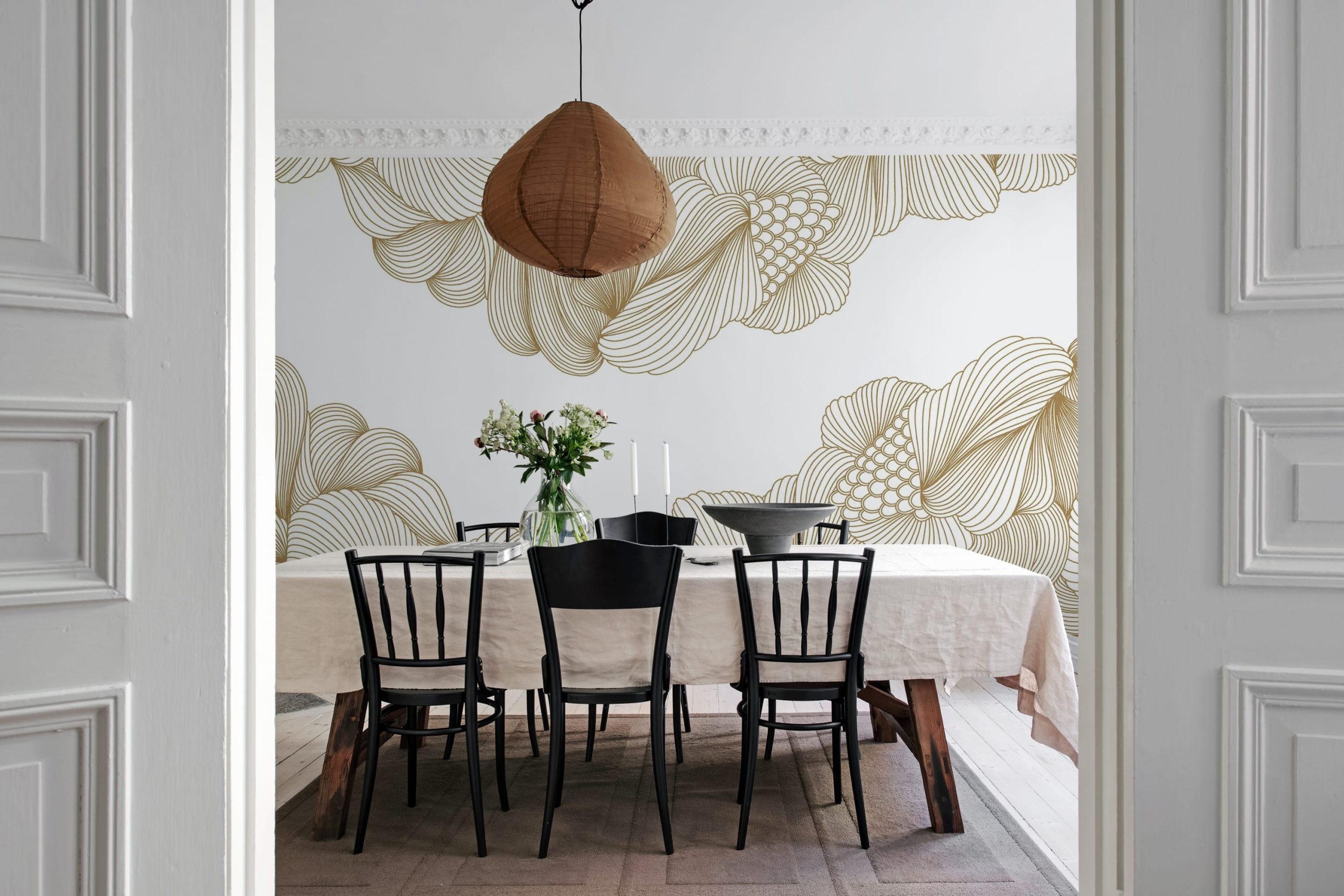 Opulence, Black Lines este un tapet luxuriant, pictat manual, cu linii aurii puternice. Un mural pentru cei cu o perspectivă modernă asupra luxului.