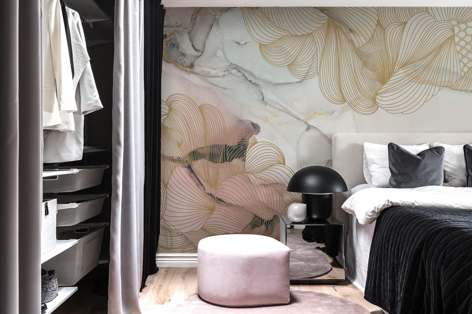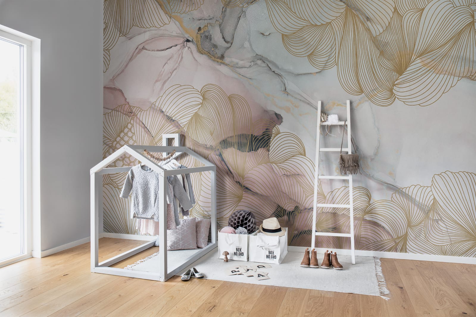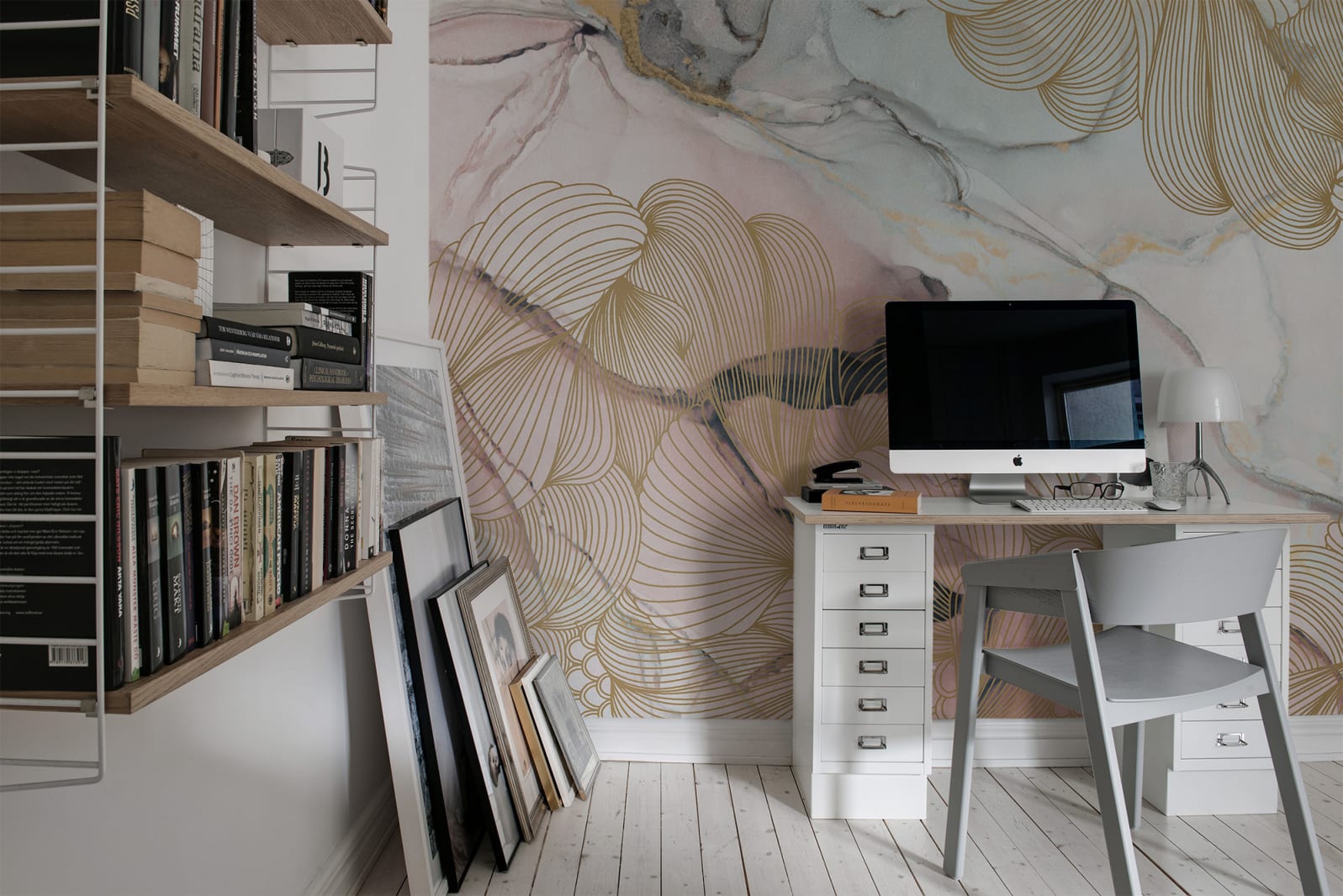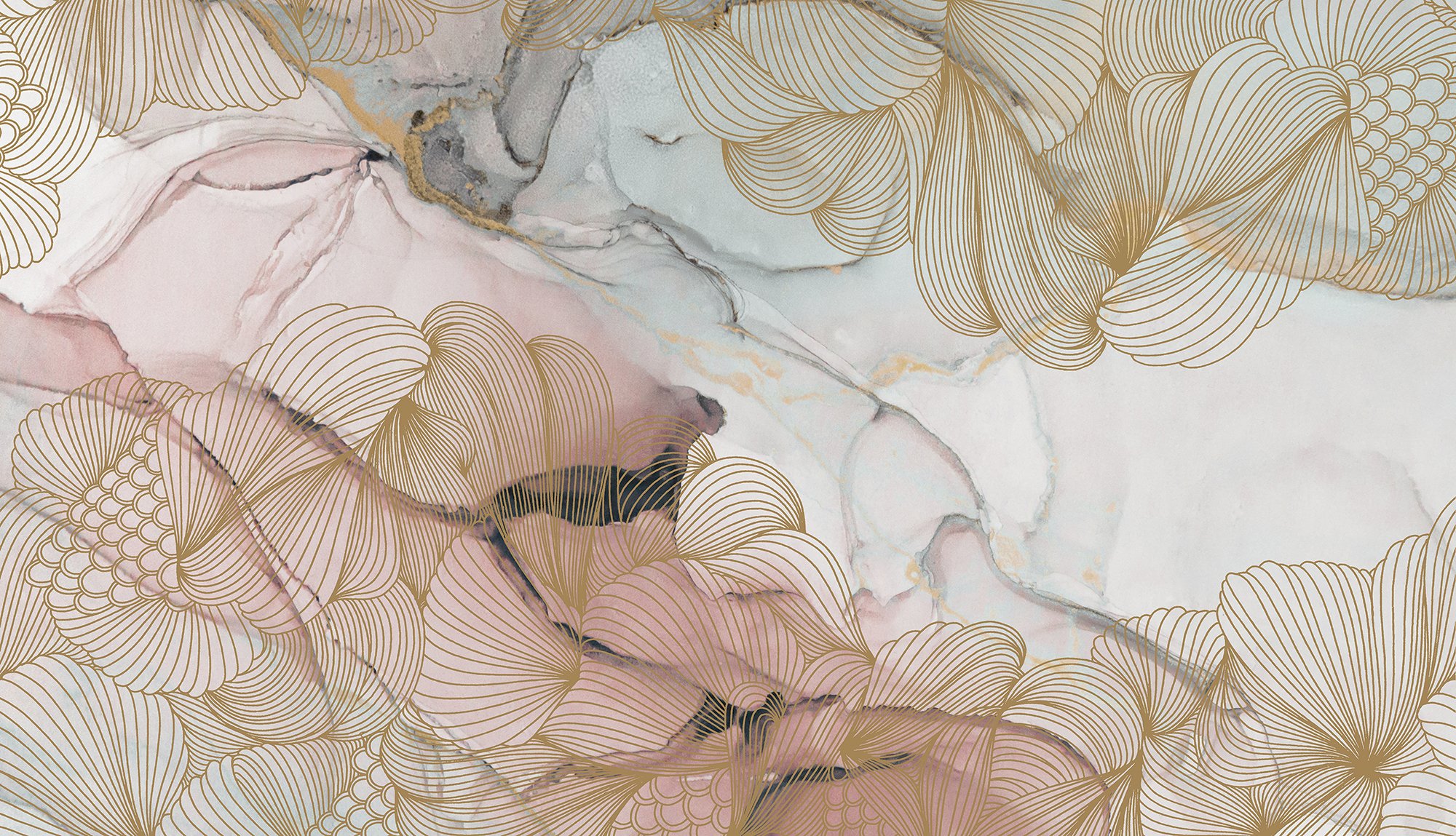 Adaugă un strop de lux și eleganță pereților tăi cu acest fototapet. Design abstract cu marmură roz și detalii aurii, perfect pentru un interior sofisticat și modern. Transformă-ți casa într-un spațiu unic!
