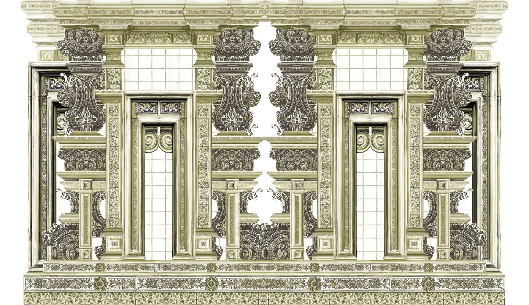 Ornamental Cathedral este punctul culminant al colecției Terracota — un mural de arhitectură monumentală, unde coloanele, arcadele și ornamentația barocă se ridică într-o splendoare poetică. Acest tapet transpune măreția sacră în grandoare interioară.