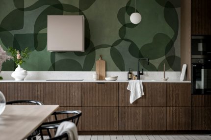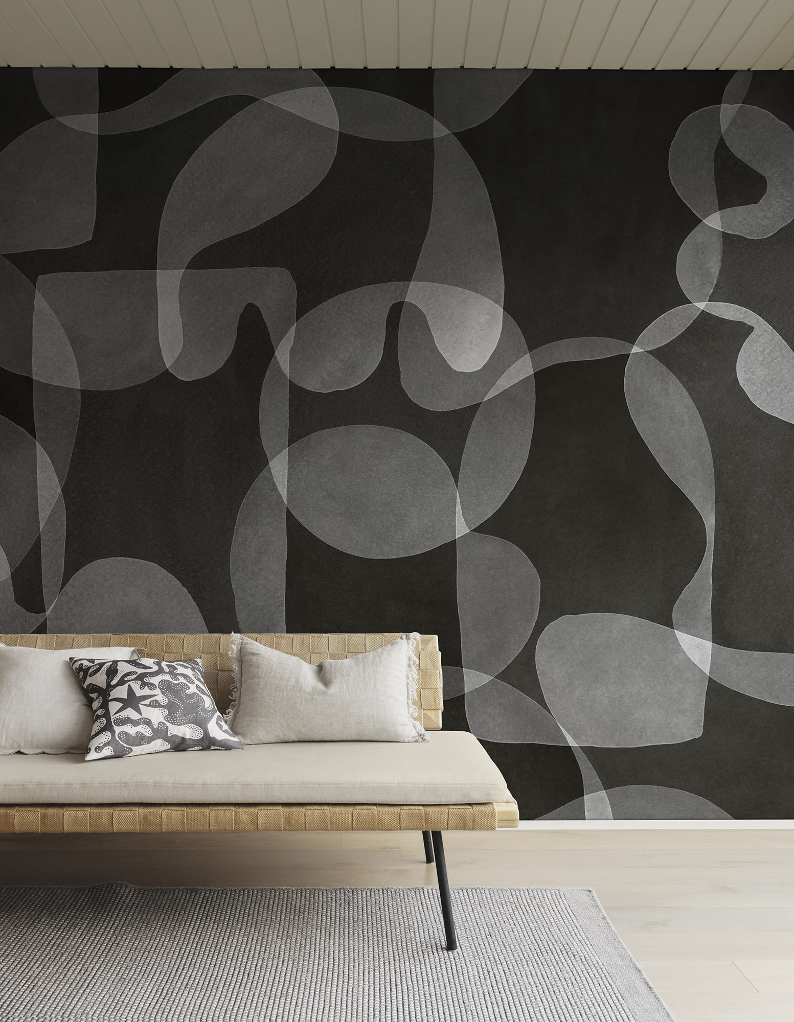 Asistați la dansul artistic al formelor abstracte suprapuse în tonuri închise. Formele transparente de acuarelă ale acestui tapet se îmbină ușor unele cu altele, creând un efect moale, fluid, perfect pentru un spațiu șic, contemporan, care caută un rafinament calm.