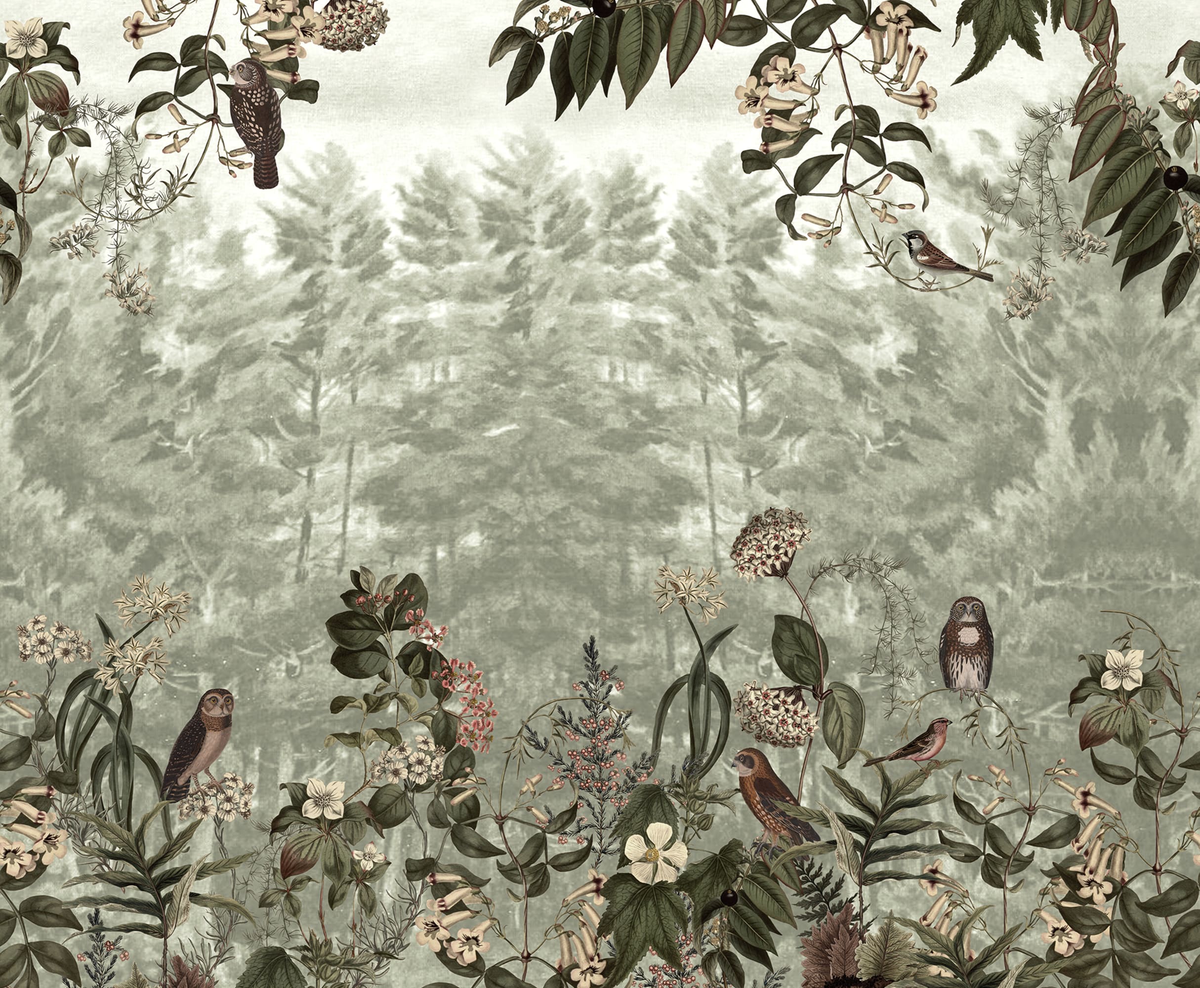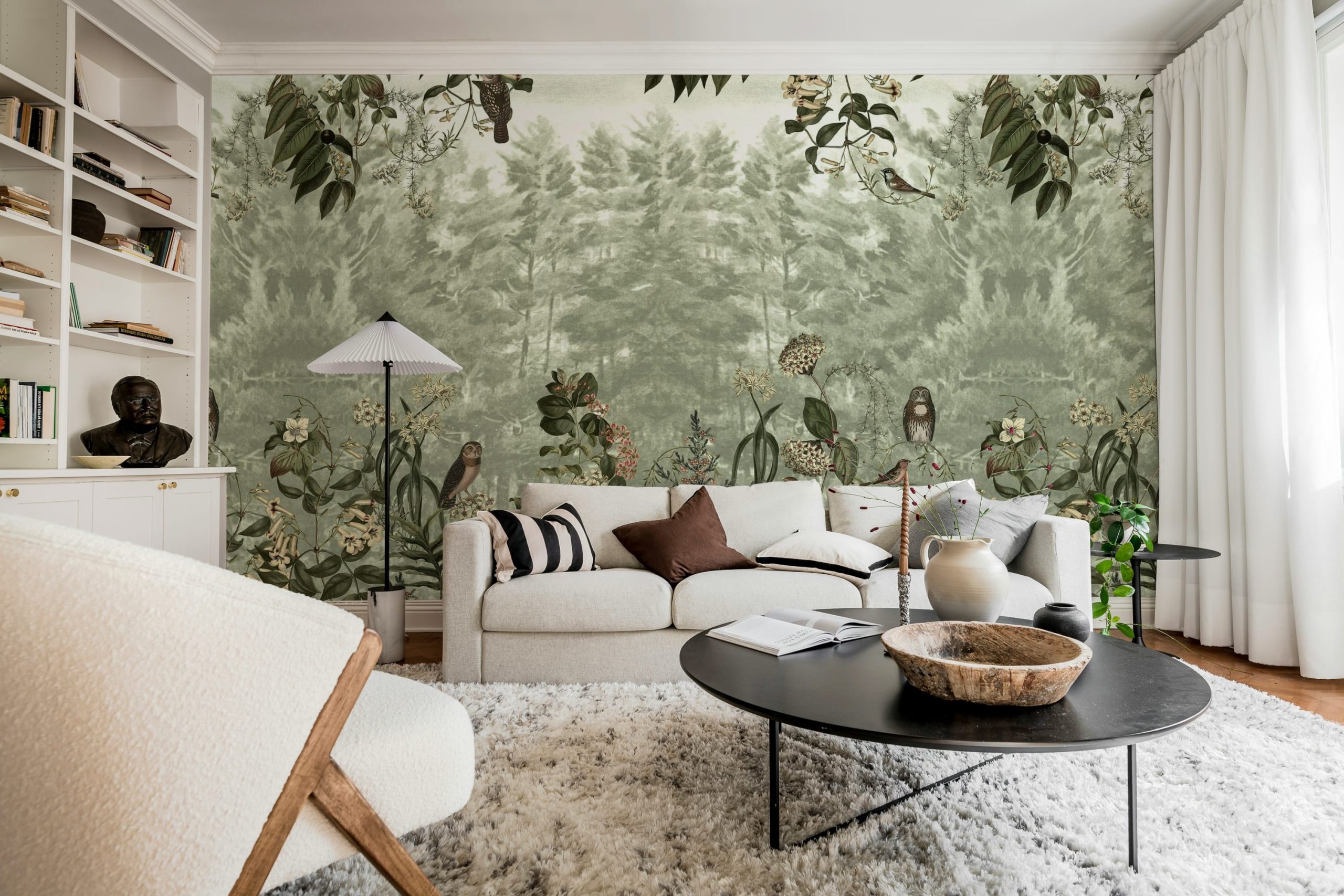 Creează un decor de poveste cu acest fototapet! Motivele delicate cu pădure, bufnițe și flori aduc natura în casa ta.