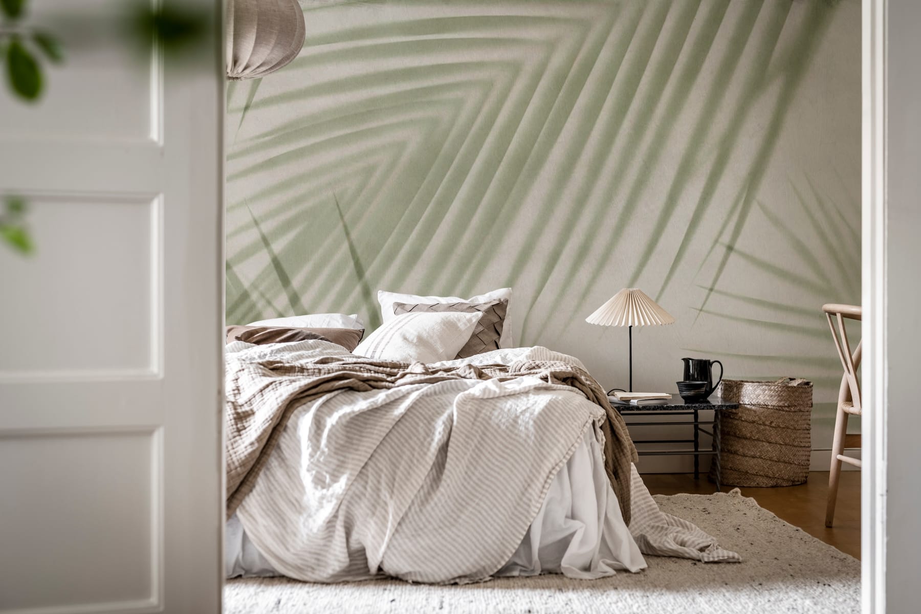 Imaginează-ți că stai pe plajă privind cerul. Umbrele moi ale frunzelor de palmier care se legănă în acest design creează o atmosferă aerisită și relaxată în spațiul tău. Varianta de culoare Green are o bază bej nisipos și frunze diafane în verde deschis.