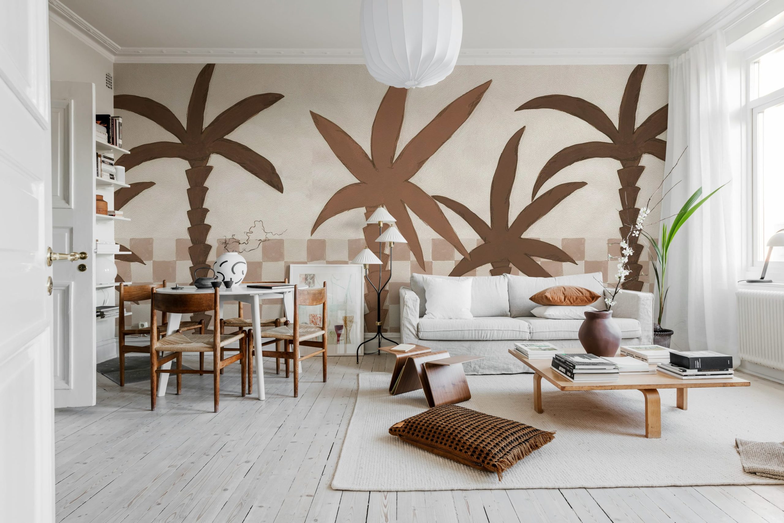 Palmierii pictați manual se leagănă pe un fundal de gresie unic. Tonurile calde de maro deschis creează o atmosferă izbitoare și contemporană, perfectă pentru cei care doresc să adauge o declarație îndrăzneață spațiului lor.