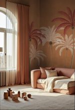 Evadează într-un paradis tropical cu acest tapet vibrant. Palmiere stilizate pe un fundal cald, portocaliu, aduc o notă exotică și relaxantă oricărui spațiu.