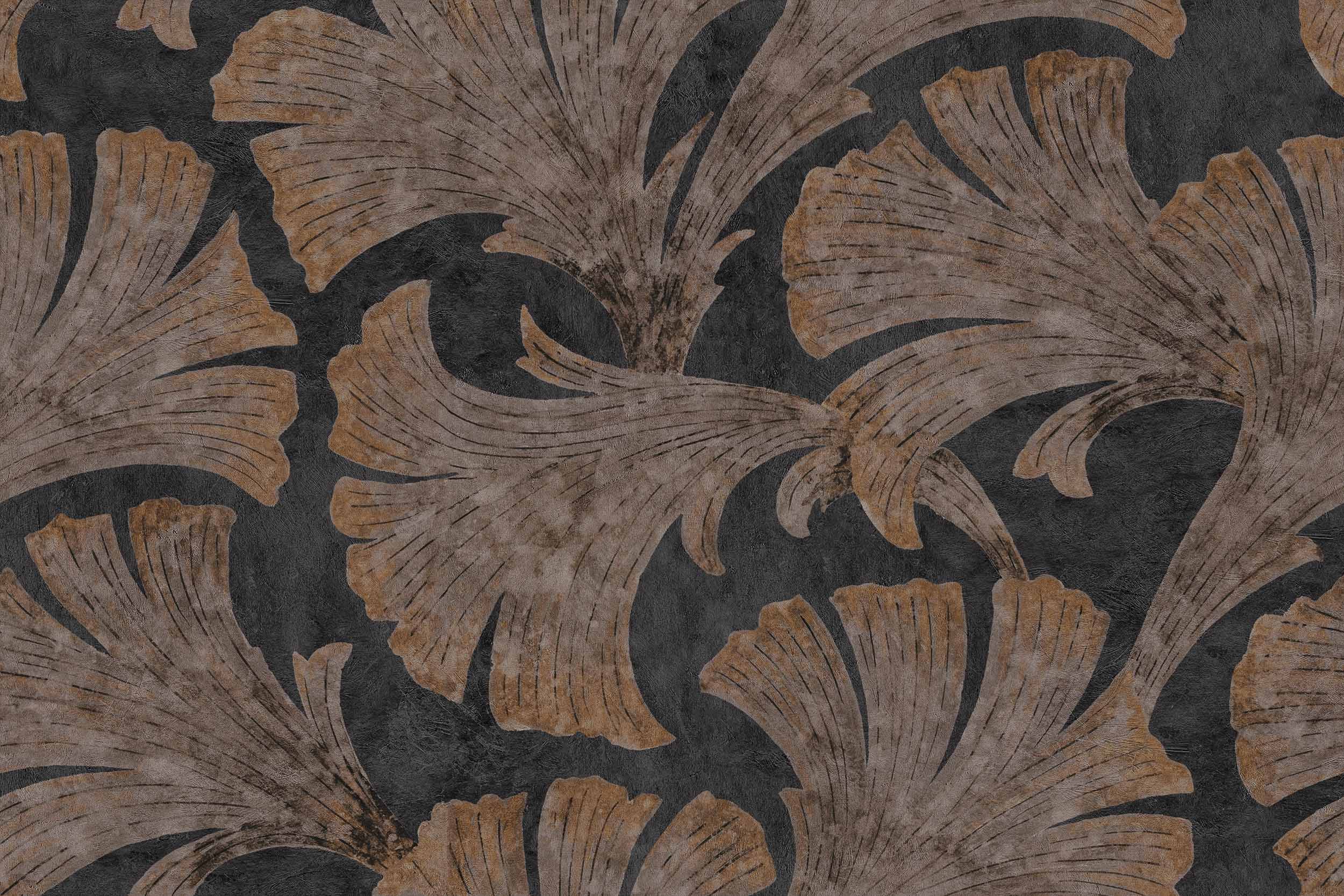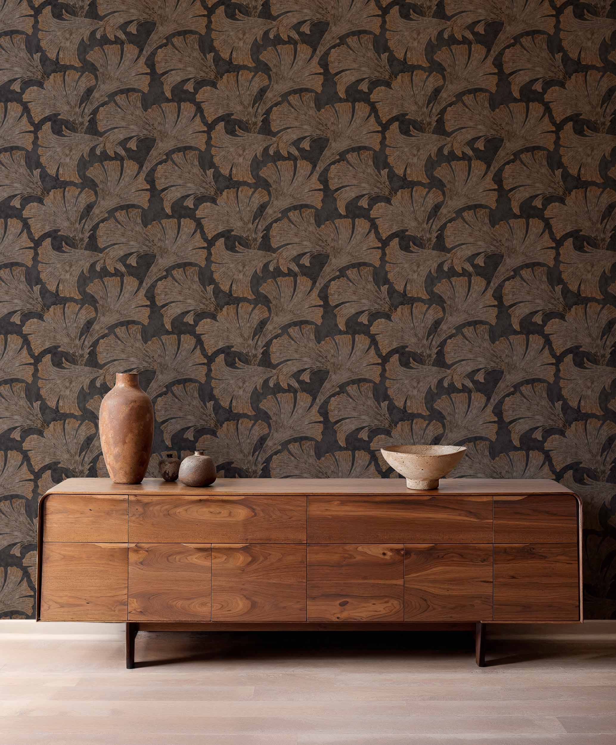 Tapet cu model abstract elegant, ideal pentru un interior sofisticat. Culoare antracit cu accente maro. 5mp/rola. Textură fină și rezistență sporită.