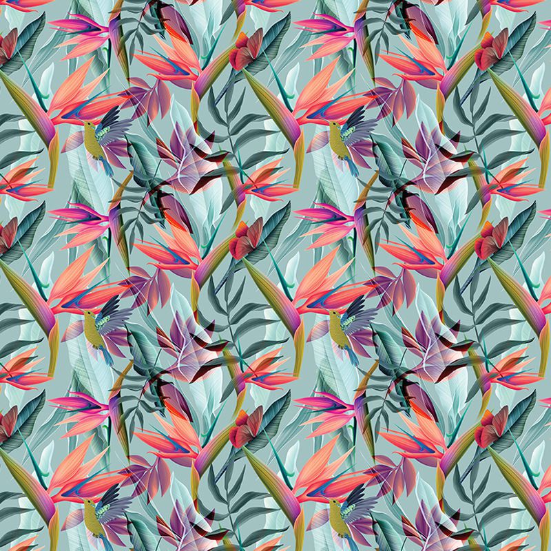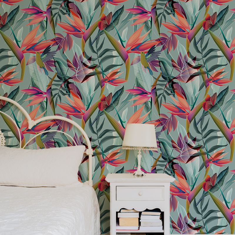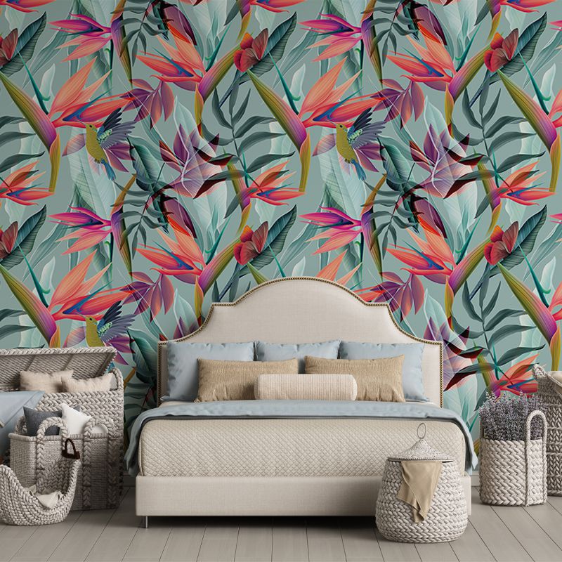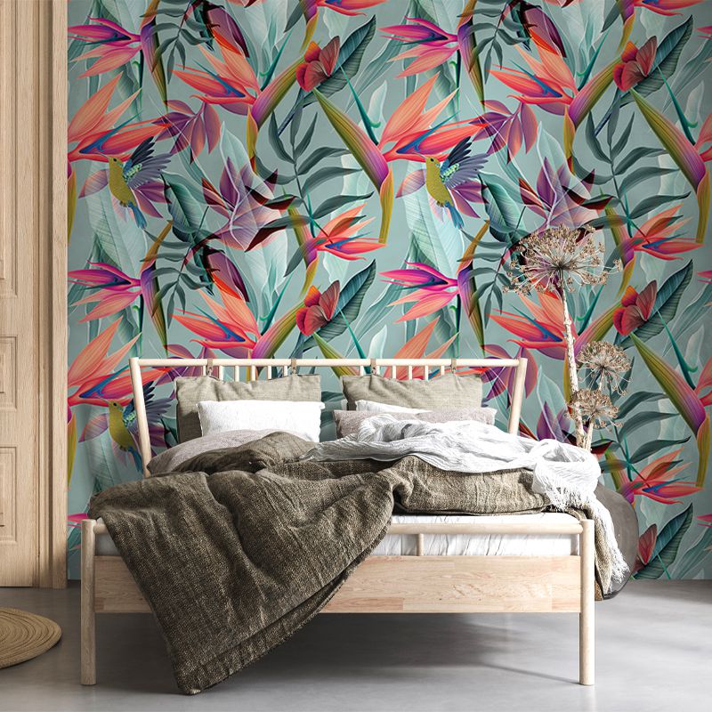 Aduceți o bucată de paradis în casa dumneavoastră cu acest tapet vibrant cu motive tropicale. Frumoasele flori portocalii și roz strălucesc pe un fundal albastru deschis, accentuând frumusețea naturii. Pasărelele delicate, cu penajul lor viu, adaugă un plus de dinamism. Acesta este un tapet ideal pentru a crea o atmosferă relaxantă și plină de viață în dormitor, living sau hol.