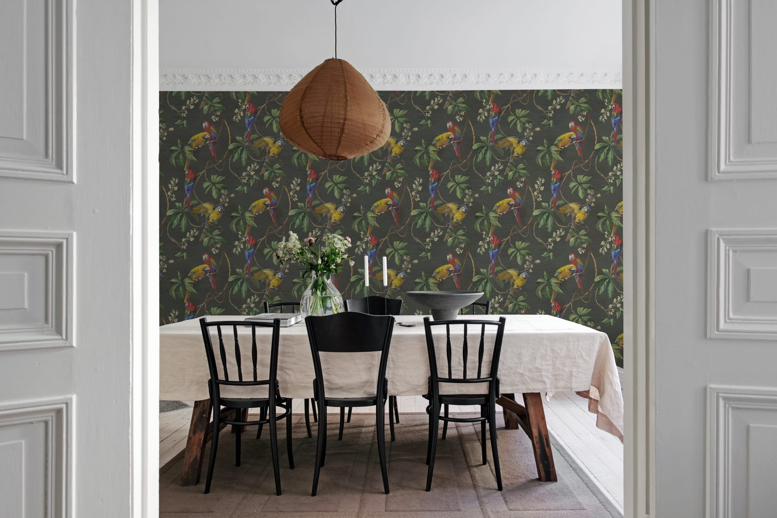 Scufundă-te într-o atmosferă tropicală luxuriantă cu tapetul „Parrots in Green”. Papagali colorați stau grațios pe ramuri, completându-se cu un fundal verde închis. Este o invitație către natură, perfectă pentru cei care caută un spațiu revigorant.