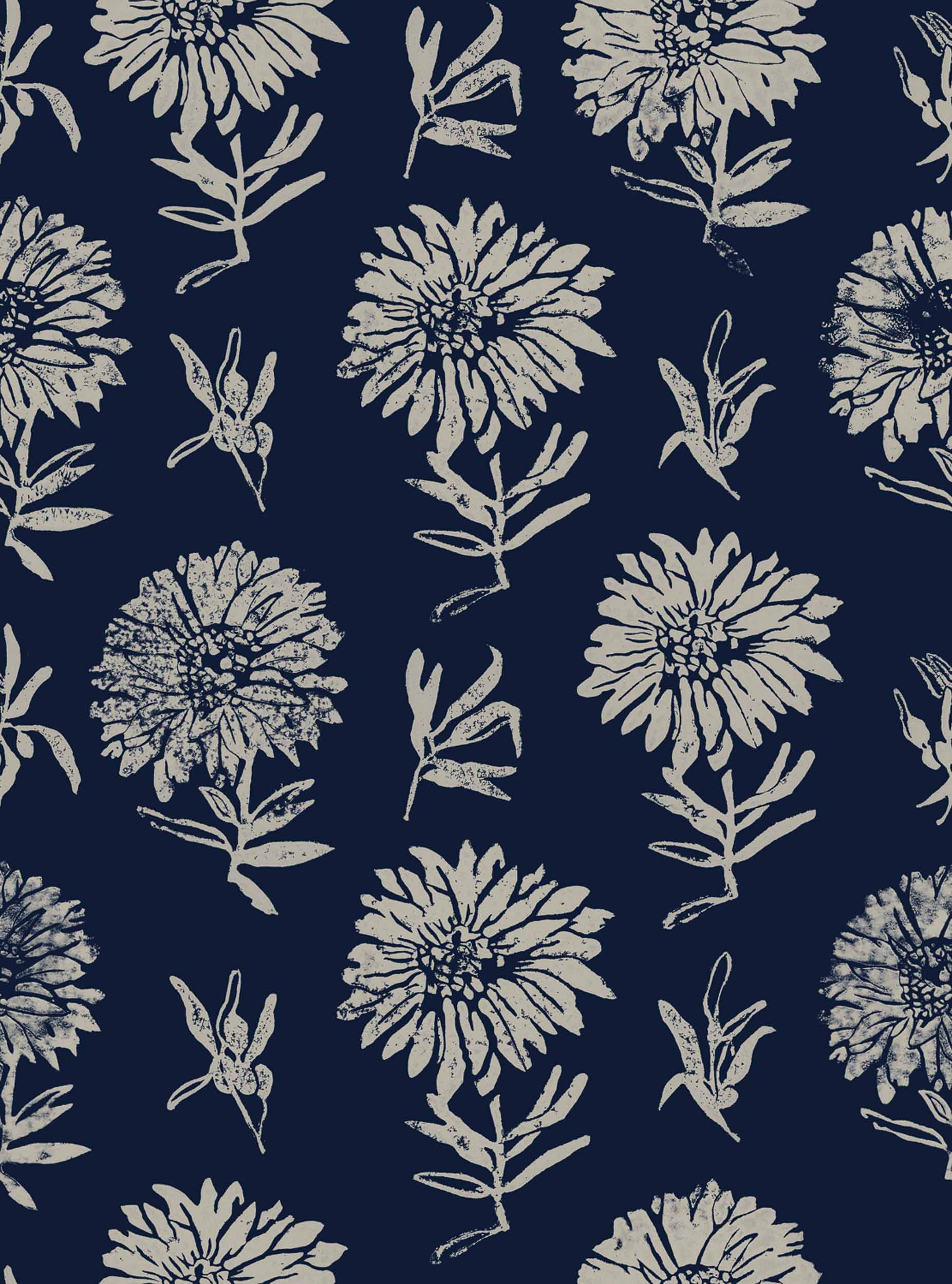 Parterre, Noche, din colecția Lur, este un design floral, în nuanțe de albastru/bleumarin. Plantații explozive de floarea-soarelui care proiectează o energie luminoasă.