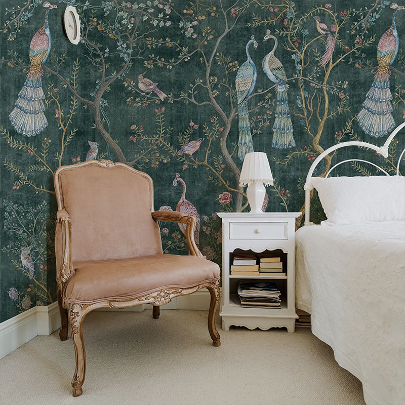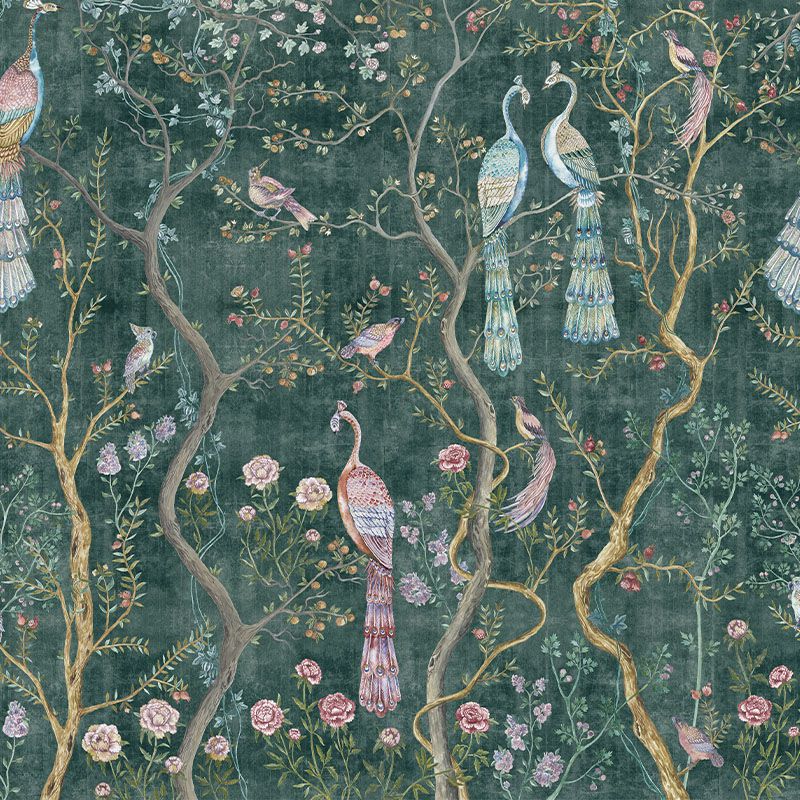 Tapetul verde smarald cu motive Chinoiserie aduce un aer sofisticat și exotic oricărui spațiu. Perfect pentru livinguri sau dormitoare elegante.
