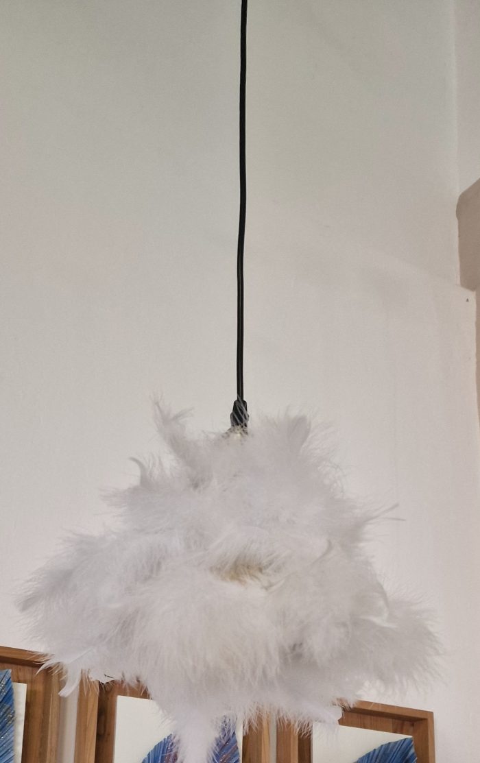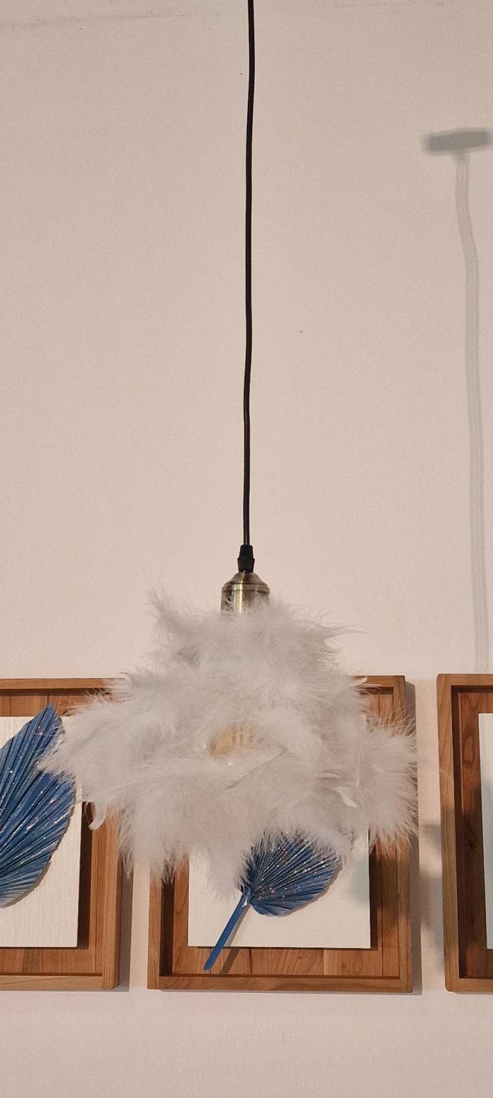 Pendul reglabil 50-140 cm, abajur spirala cu pene naturale albe 40×30 cm; un articol deosebit, care imprima o nuanta diafana amenajarii. Disponibil si in alte nuante.
