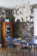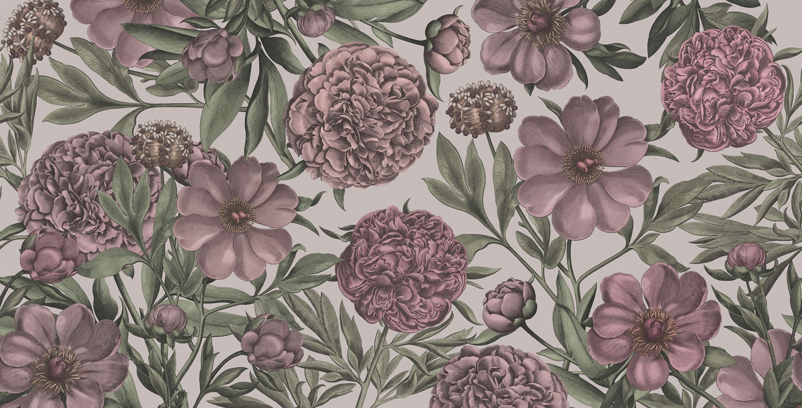 Bucurați-vă de bujori! Ilustrații vintage mari și luxoase. Un model elegant, dar jucaus, în care scara mare adaugă acea nota suplimentară de deliciu de care fiecare spațiu o are nevoie. Peony Delight, Midnight, vine în nuanțe frumoase de verde și mov palid pe un fundal bej.