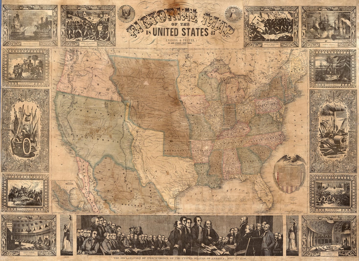 O frumoasă hartă din 1847, a Statelor Unite cu imagini decorative.