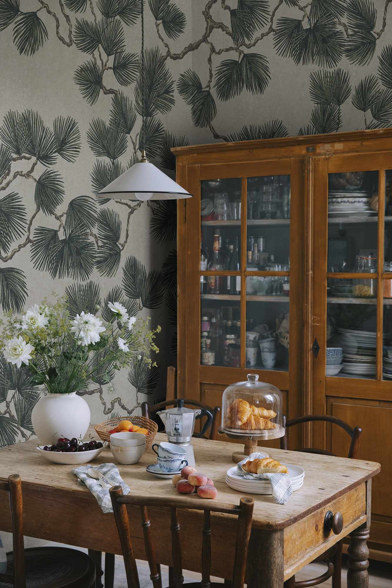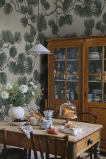 Pinii rupți de vânt stau mândri în grupuri lângă pajiștile de coastă din Öland. Pine Mural este o versiune mărită a îndrăgitului nostru model Pine, în care ramurile cu ace pluminoase acoperă peretele într-un dans ușor și aerisit. Viu, dar senin. Pine Mural, Green, are o bază gri cald cu ramuri maro și ace verzi luxuriante.