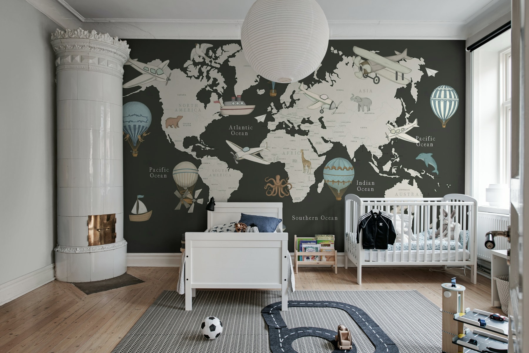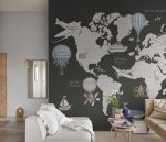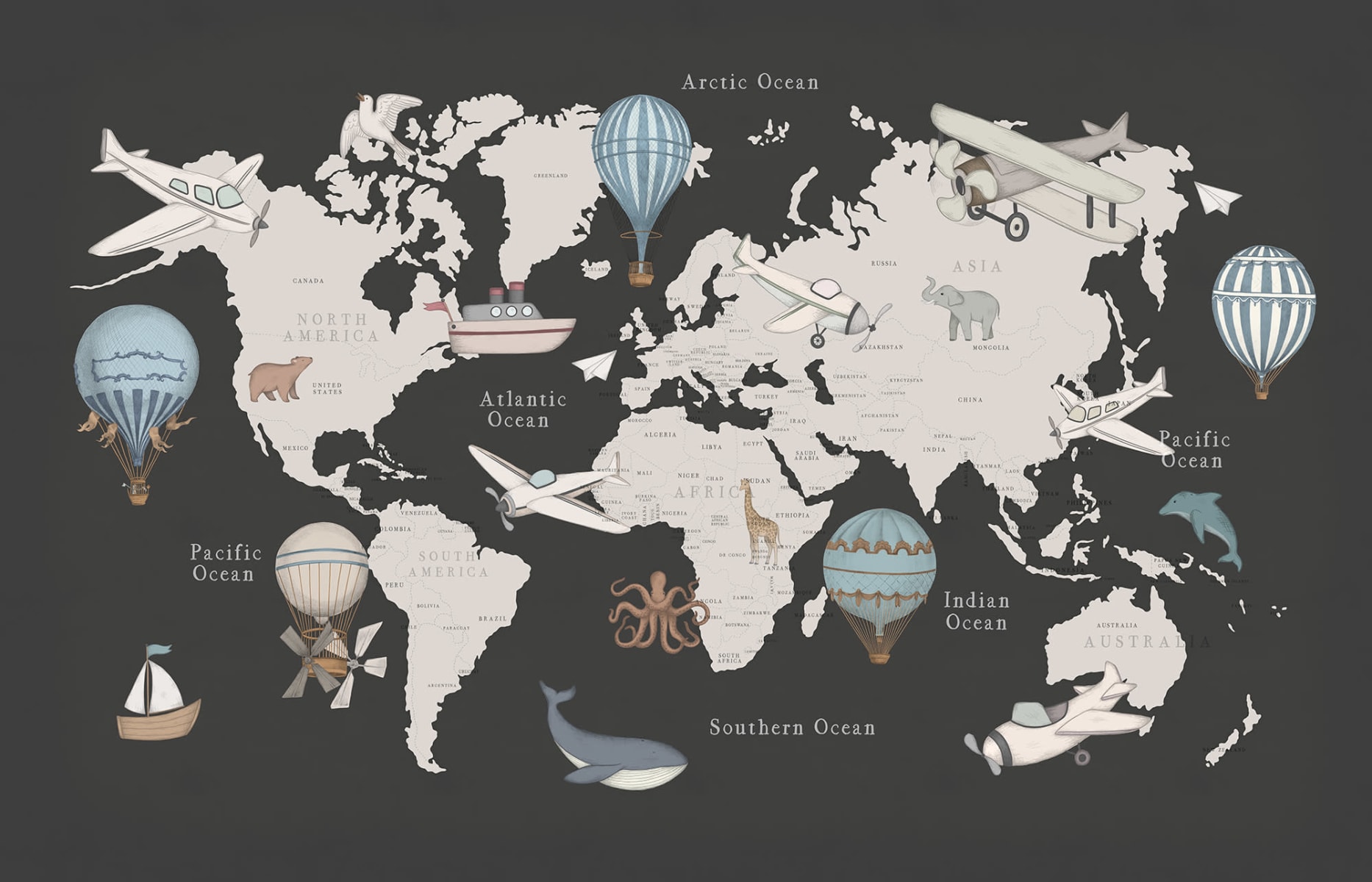 Descoperiți o lume cu animale adorabile, bărci, avioane și baloane, adăugând o notă decorativă și educativă pereților dvs. Acest model drăguț este disponibil în mai multe variante de culori armonioase. Playful World, Dark Blue, are o bază albastru închis, o hartă gri deschis și detalii frumoase în nuanțe de albastru închis și maro.
