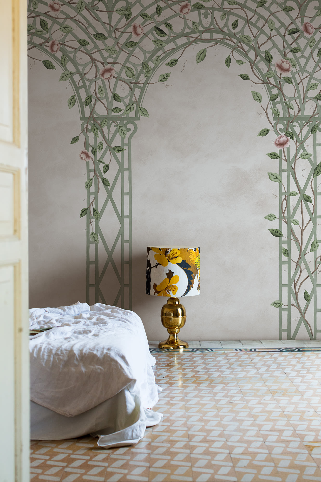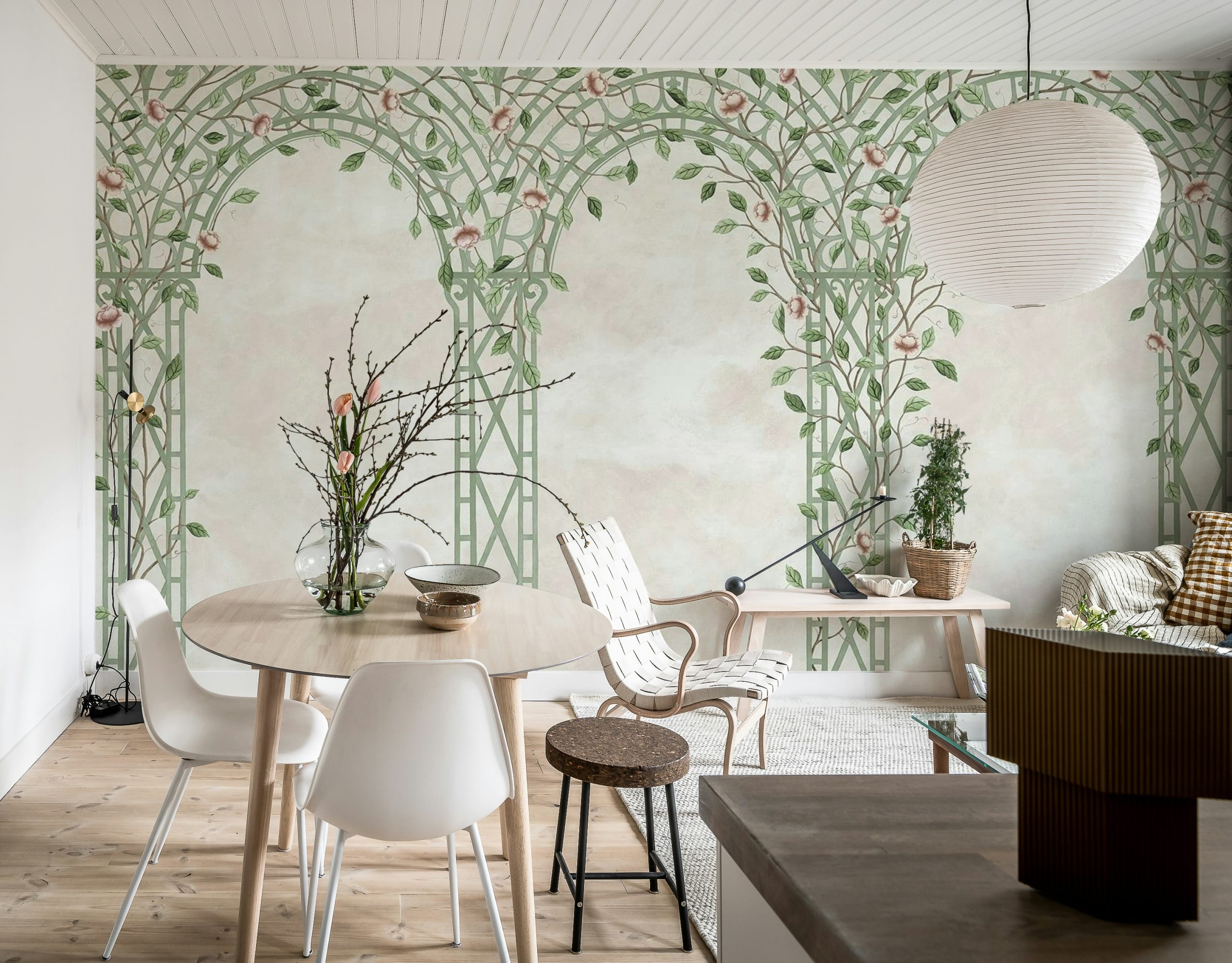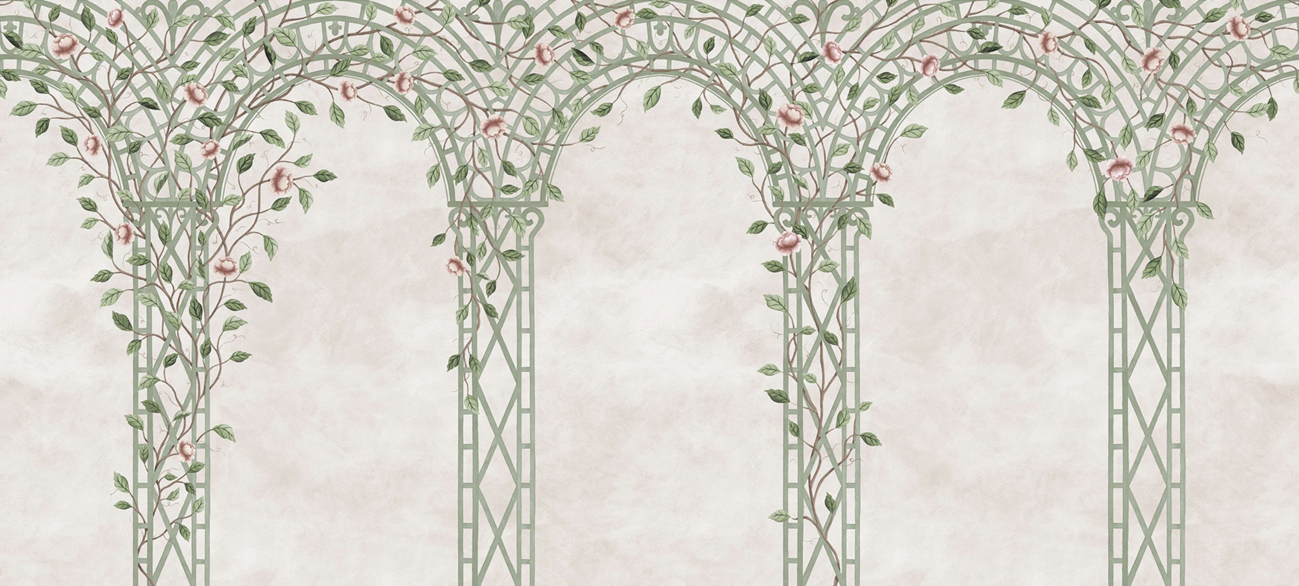 Acest tapet poetic pictat manual aduce luxul subtil vintage în casa dvs. Designul delicat cu zăbrele împletite cu trandafiri cățărători emană artă și rafinament. Fiecare lovitură de pensulă dezvăluie o atenție meticuloasă la detalii, creând o atmosferă senină și încântătoare care se simte ca un sanctuar de grădină în interior. Culoarea Green are o bază moale, bej deschis, împodobită cu un spalier și trandafiri sinuoși în verde și roz.