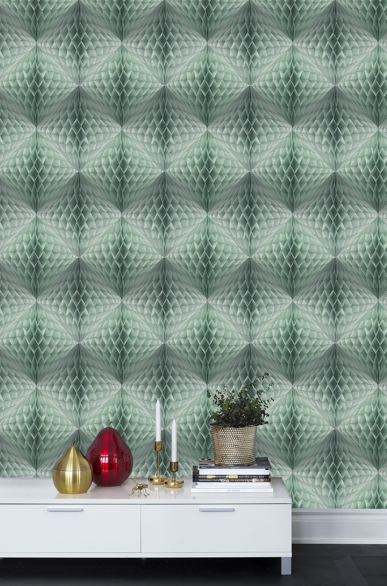 Decorațiuni confecționate parcă din hârtie, într-un fototapet cu efect tridimensional. Pom Pom Mint, cu model geometric 3D, este desprins dintr-un tărâm al viselor. Imaginea se joacă cu percepția privitorului, creând iluzii optice fantastice și oferă senzația de adâncime, transformând orice perete în punctul focal al întregii încăperi! Pentru un decor modern deosebit.