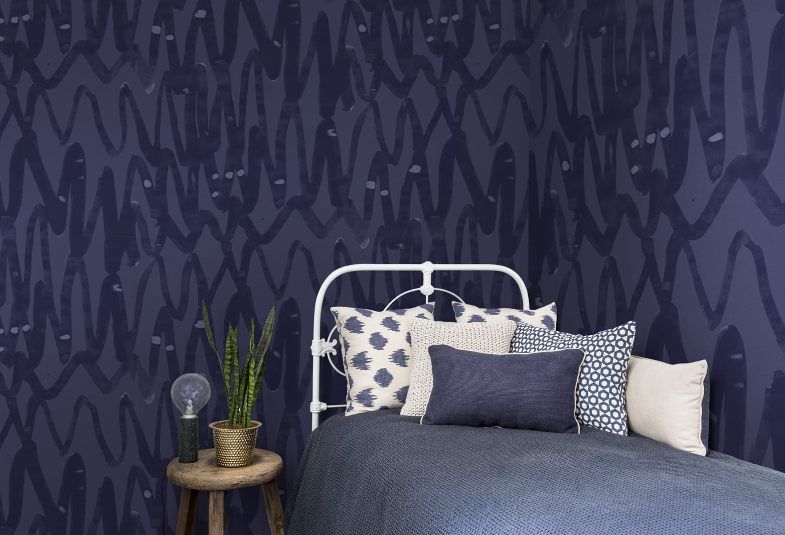 Un fototapet albastru închis, cu mișcări late de pensulă, opriri bruște ale liniilor, care generează propriul tipar. Acesta este un tipar extravagant, dar ne place!