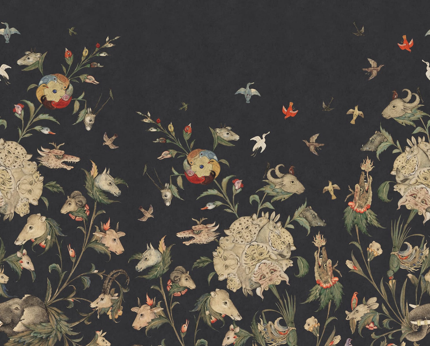 Răsfățați-vă într-o lume a fanteziei și a imaginației cu Quirky World, Night – un tapet extraordinar care combină frumusețea suprarealistă a plantelor cu cap de animal și grația păsărilor ce zboară pe un fundal întunecat captivant.