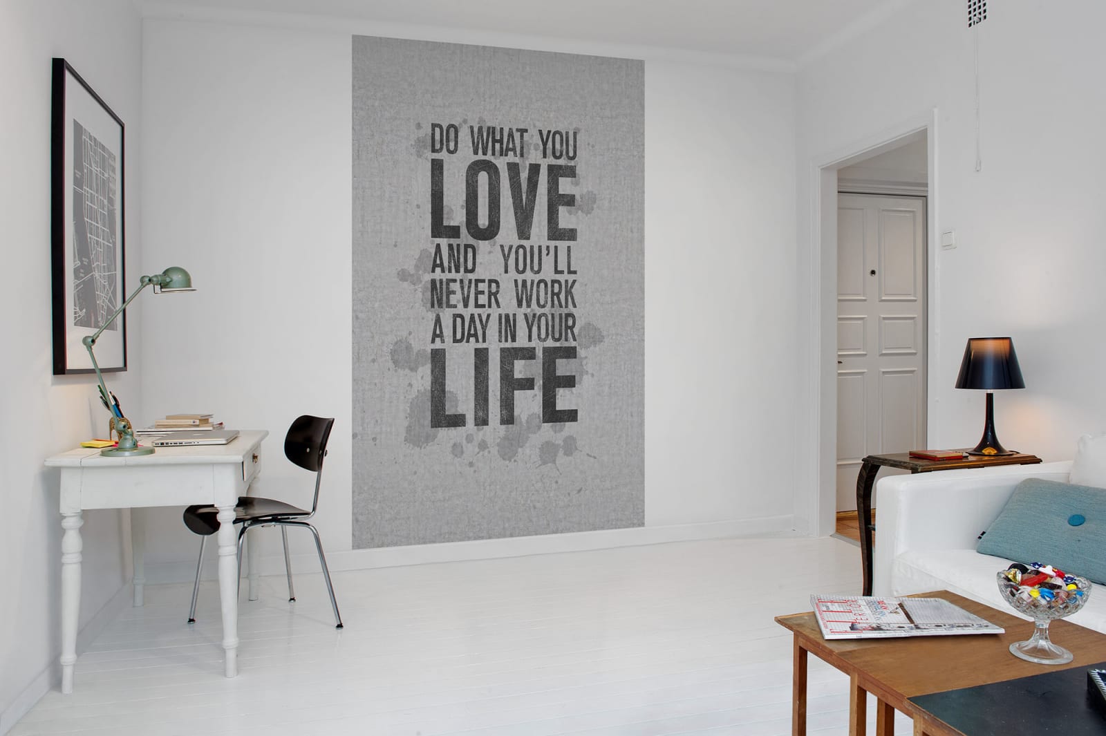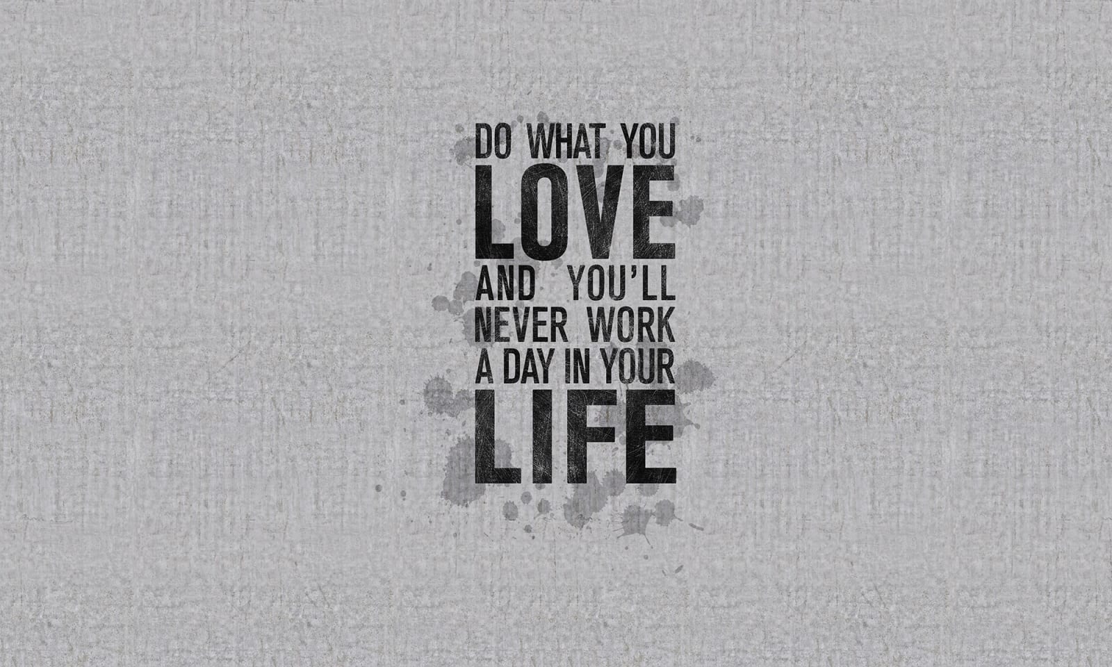 Un mesaj inspirațional, pe un perete care pare din beton: Fă ceea ce iubești și nu vei munci o zi în viață. Fototapetul Quotes va transforma orice perete în punctul focal al încăperii.