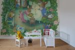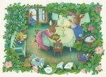O încântătoare familie de iepurași în casa lor, împodobită cu frunze bogate, flori și fructe de pădure. Acest tapet cu siguranță aduce o drăgălășenie maximă. Poți vedea iepurașul mic ascuns, agățat de rochia mamei? Pur și simplu adorabil. Lucrare de artă realizată de faimosul ilustrator Ilon Wikland.