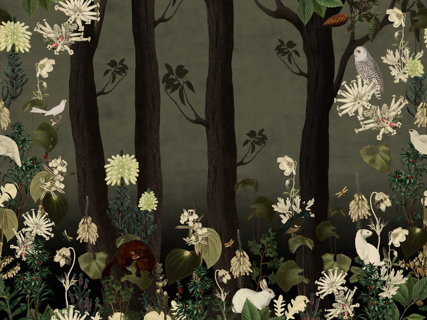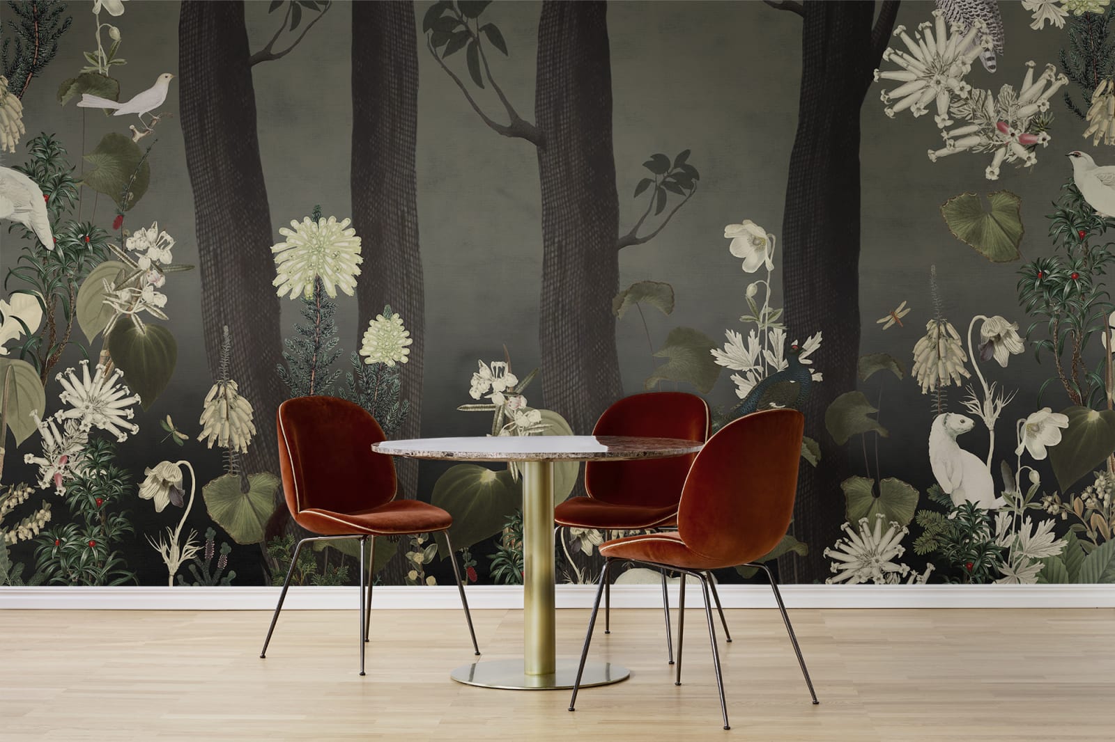 Acest tapet imaginar vă va îmbrățișa peretele într-un mod unic. Partea inferioară a acestui mural este mai întunecată, ceea ce va oferi camerei o fundație sigură și odihnitoare pentru a sta pe picioare. Apoi, plantele și animalele interesante apar la diferite înălțimi din jurul trunchiurilor de copaci frumos conturate.