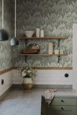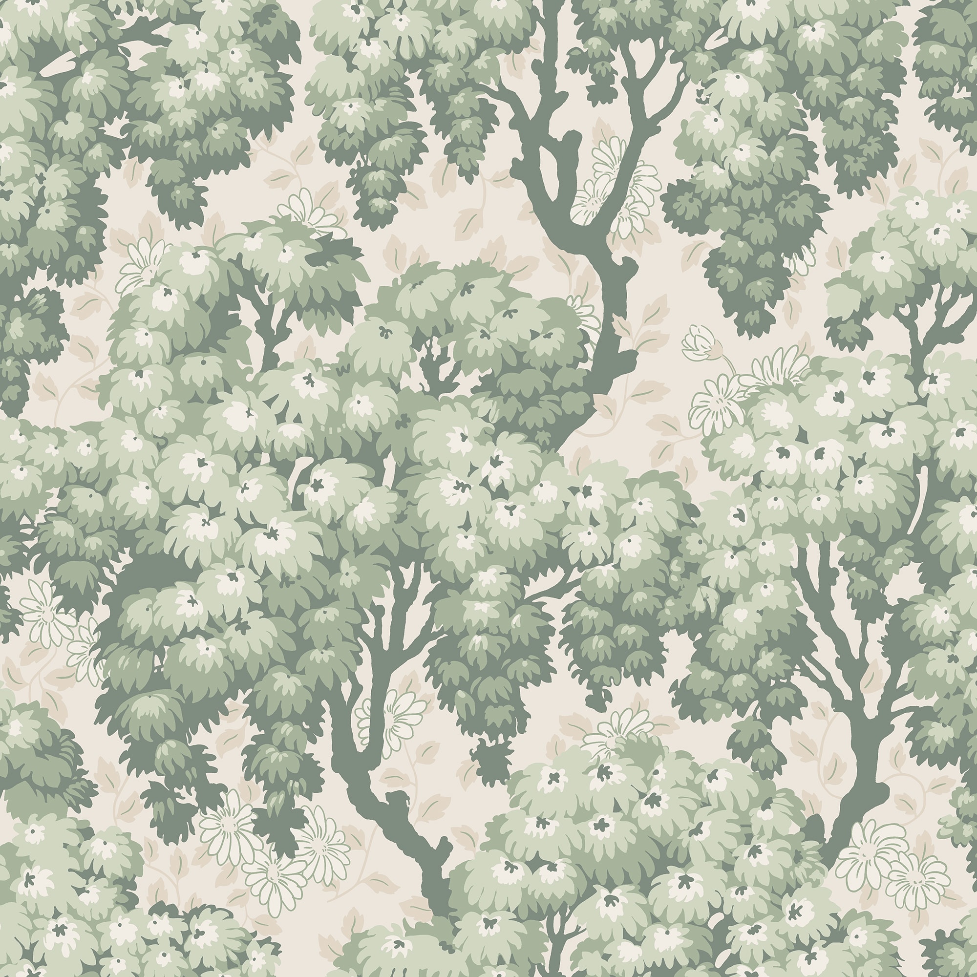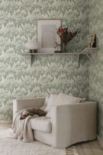 Acoperișurile luxuriante ale copacilor pe o pajiște de margarete creează o perdea armonioasă, cu modele mari pe perete. Modelele detaliate de frunze și margarete mici sunt împletite pentru a crea un sentiment înălțător de cer blând și înnorat. Bazat pe un original mai vechi de la începutul anilor 1900. Ragnvi, Verde, are o bază bej moale și frunze în nuanțe plăcute de verde.