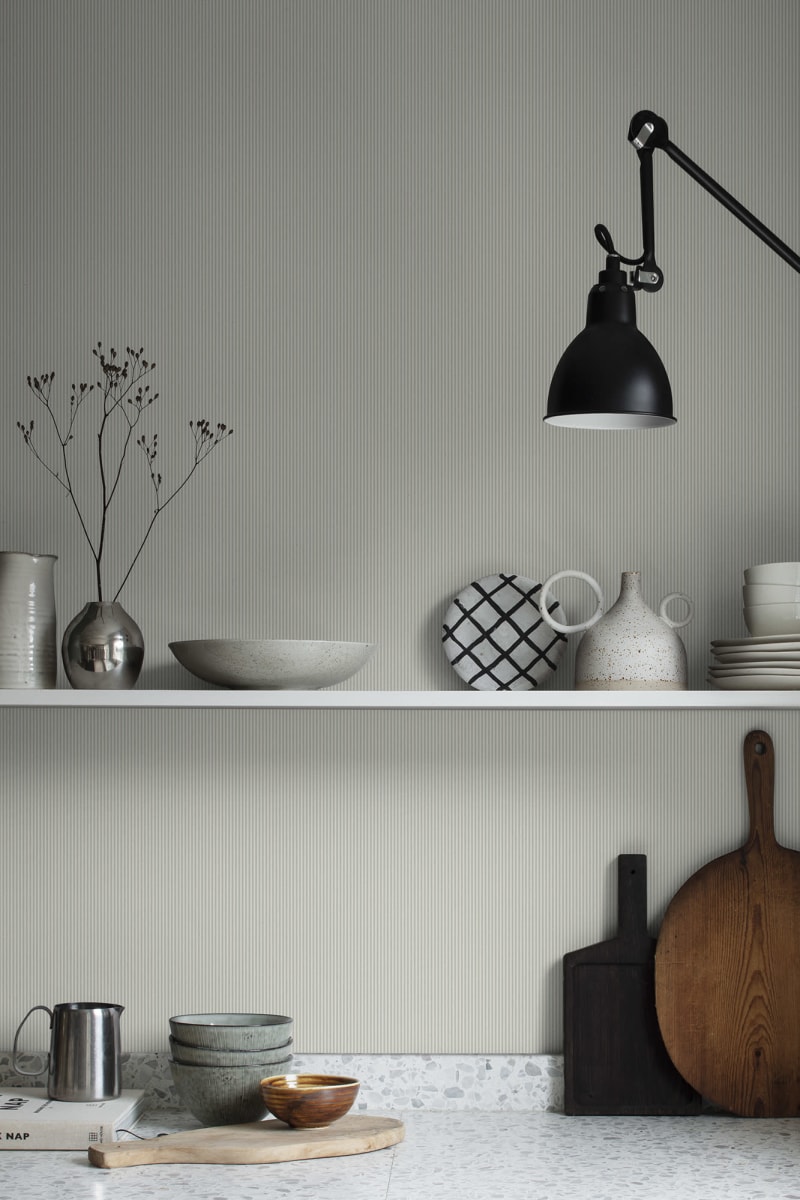 O lucrare cu dungi, cu aspect de textil țesut, care creează un aspect simplu privit de la distanță și care reprezintă una dintre cele mai bine vândute lucrări ale noastre. Rand înseamnă dungă în suedeză, iar tapetul Rand Garden Green are un model în dungi cu linii albe și verde deschis.