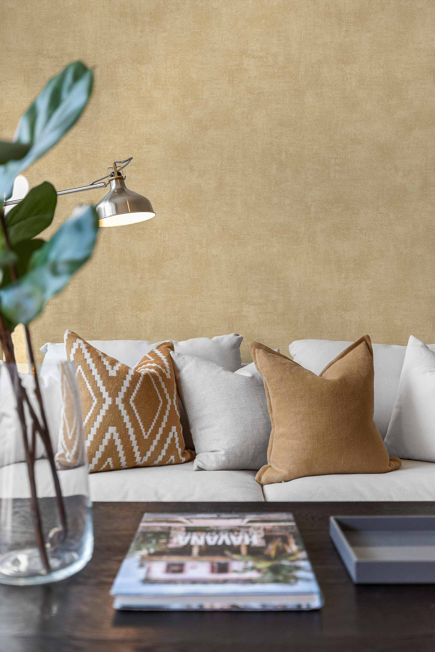 Tapetul Lin Ocre de la Coordonné este un design texturat în tonuri de galben/portocaliu din colecția Palette. Nuanțe calde de