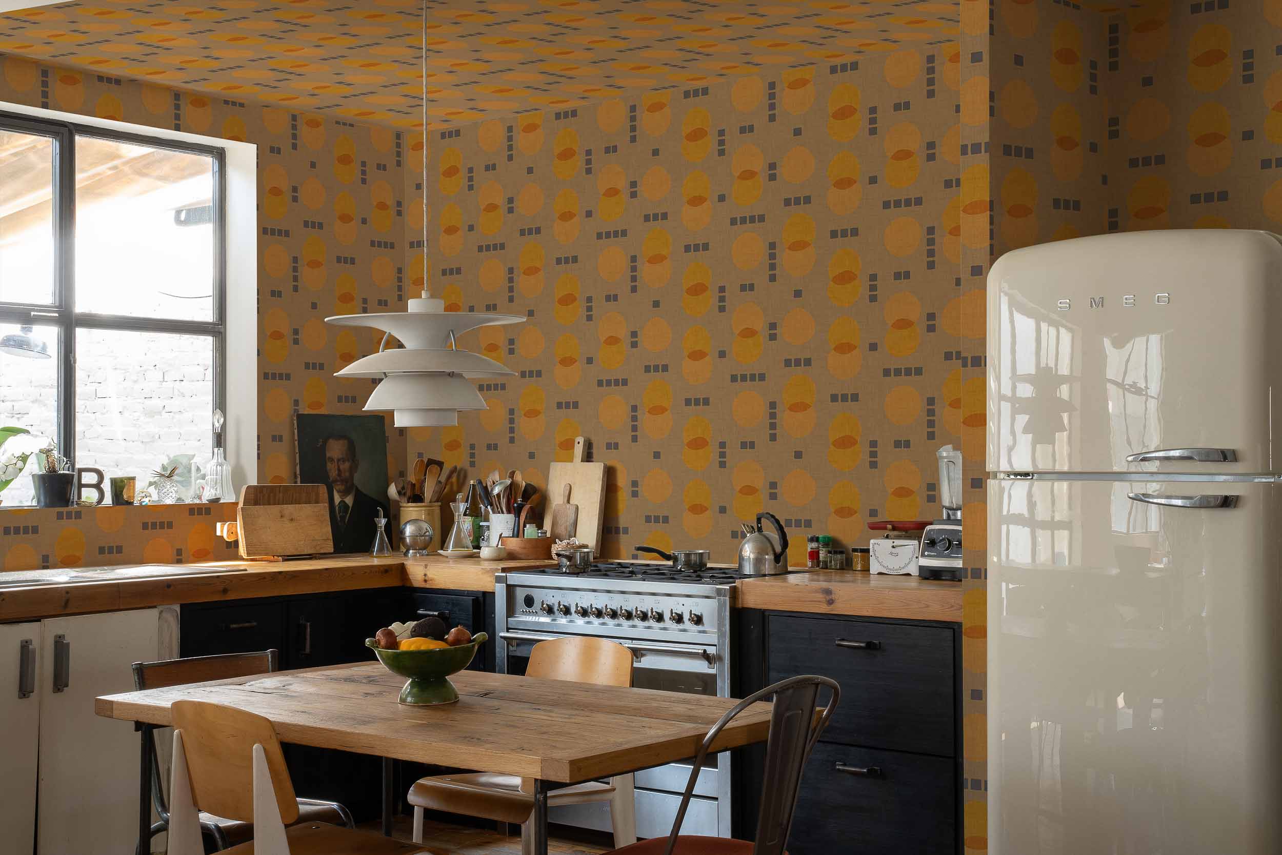 Rebel Dots, Cinnamon, din colecția L’Enfant Terrible, este un design geometric, în nuanțe de galben/portocaliu. Buline care își fac loc printre rândurile organizate geometric.