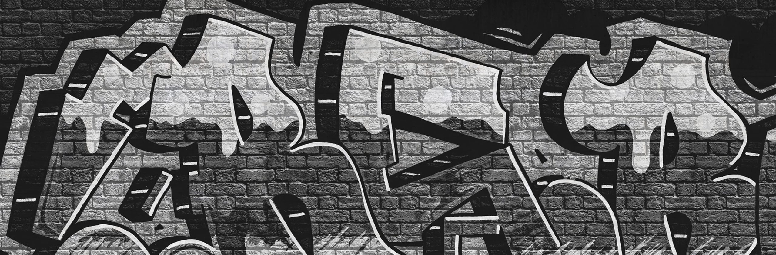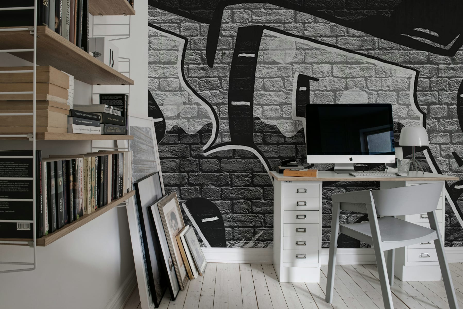 Tapetul Rebel Graffiti Bold, Gray prezintă elemente frapante de graffiti alb-negru suprapuse peste un perete de cărămidă gri. Liniile îndrăznețe și expresia artistică a graffiti-ului adaugă un sentiment de creativitate, perfect pentru încăperi moderne, dormitoare sau orice spațiu care necesită o declarație urbană. Fundalul texturat din cărămidă adaugă profunzime și autenticitate, punând în valoare designul inspirat de arta stradală. Rebel Graffiti Bold, Gray este ideal pentru cei care doresc să aducă un sentiment brut, artistic în casa lor, creând un spațiu cu personalitate și farmec urban modern.