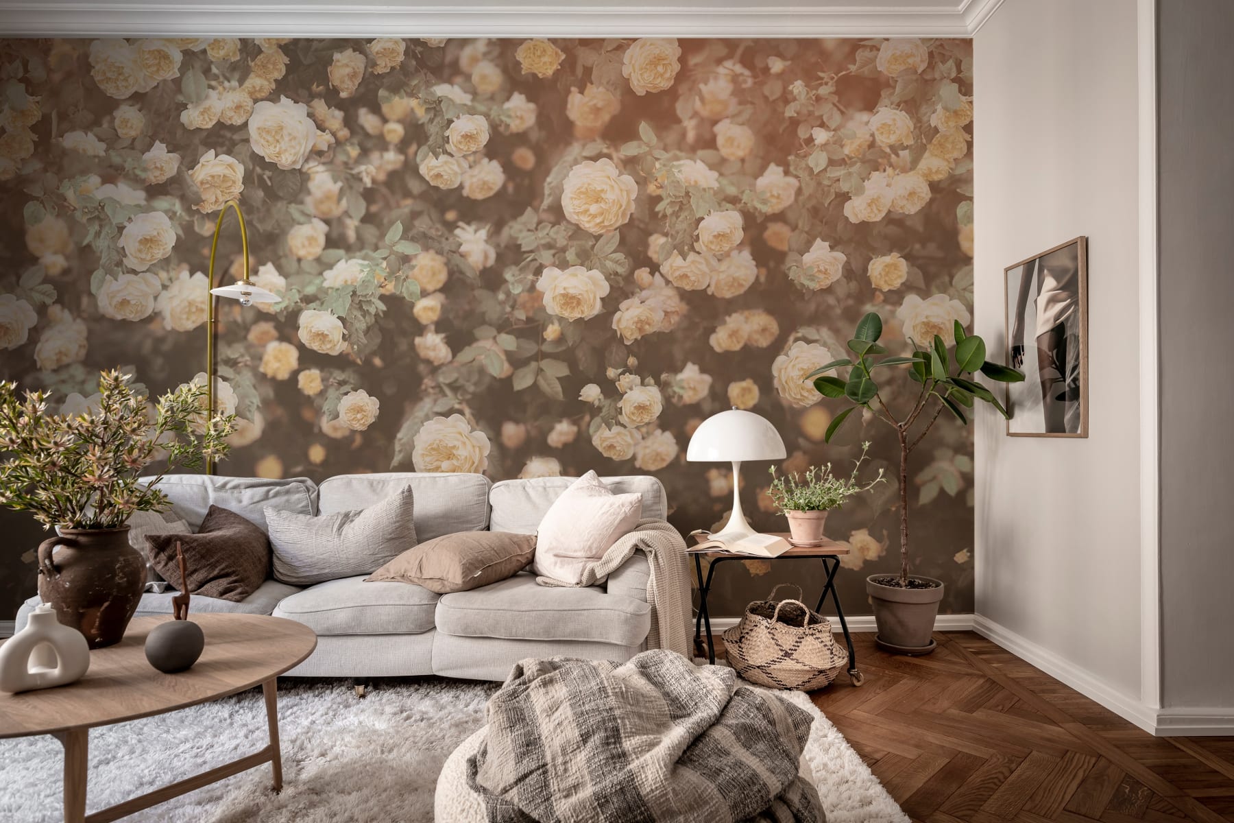 Acest design, cu trandafiri regali abundenti sub razele blânde și visătoare ale soarelui, ne trezește amintiri. Un design încântător și primitor, perfect pentru a crea un spațiu confortabil și călduros. O alegere spectaculoasă pentru un dormitor! Varianta de culoare Vintage vine cu trandafiri în nuanțe gabene delicate si frunziș verde.