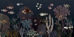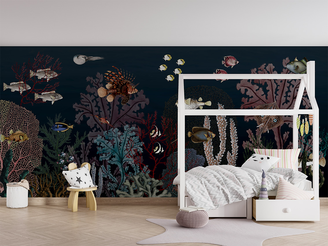 Acest Roaring Reef – Blue prezintă o colecție vibrantă de pești, corali și alte creaturi marine, pictate cu detalii uimitoare pe un fundal albastru închis. Perfect pentru a aduce o notă de eleganță și mister în dormitorul copiilor.