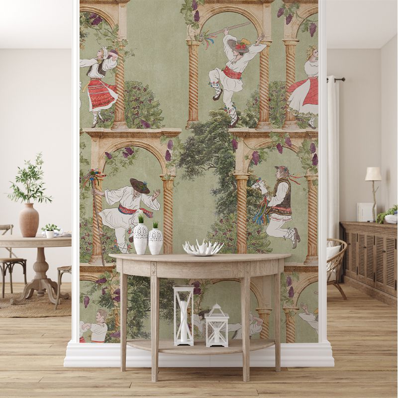Adaugă un strop de tradiție românească casei tale cu Roata de la Runc În iarbă! Acest tapet unic prezintă o imagine vibrantă a dansatorilor tradiționali români, înconjurați de viță de vie luxuriantă și coloane elegante. Culorile calde și detaliile fine aduc o atmosferă autentică și un aer rustic spațiului tău. Perfect pentru living, dormitor, hol sau chiar și pentru a adăuga un accent unic în bucătărie.