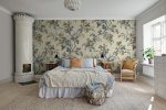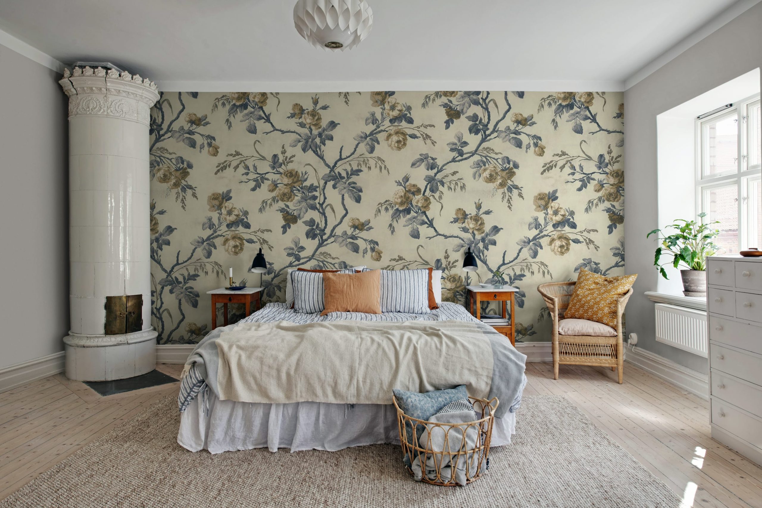 Creează un decor elegant cu acest tapet floral superb. Designul romantic cu ghirlande de trandafiri albastri aduce un aer sofisticat oricărui spațiu.