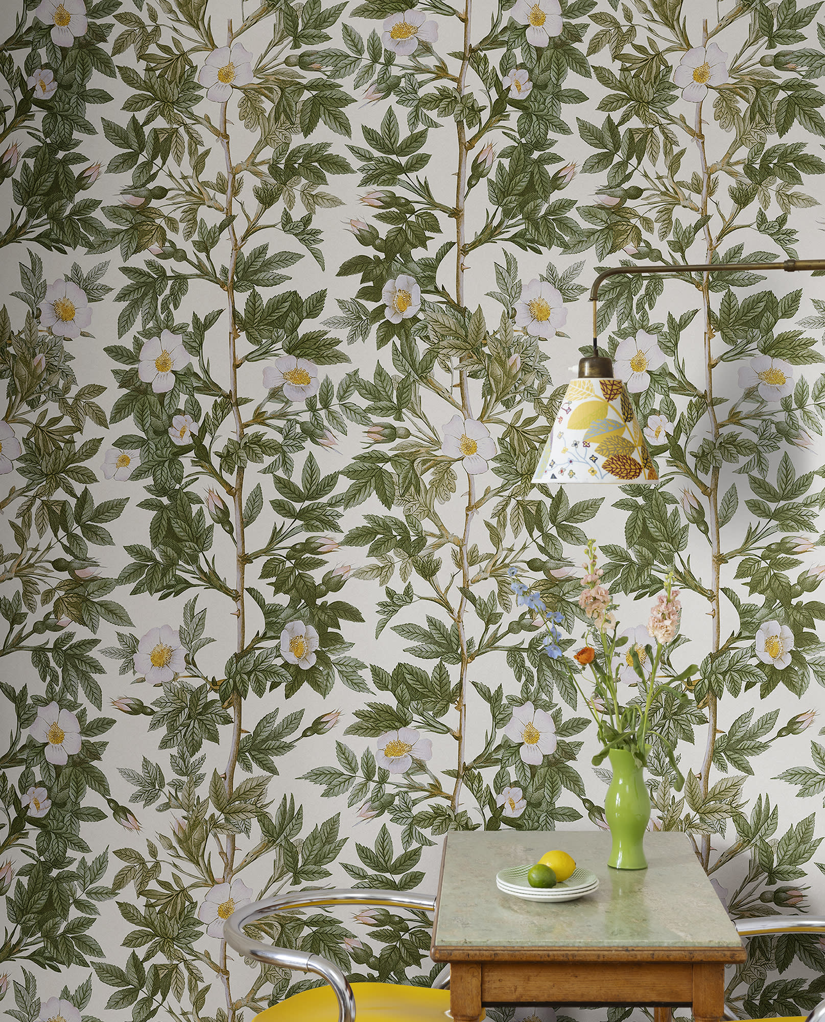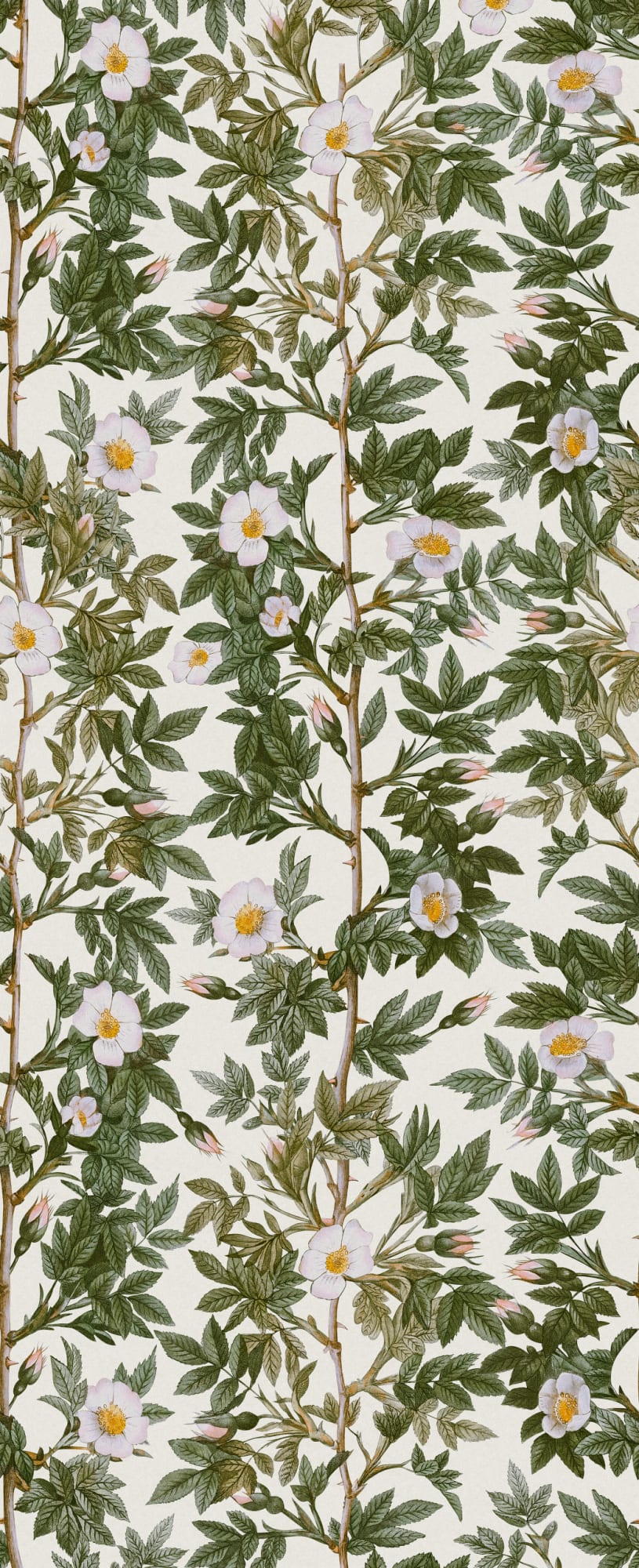 Trandafiri cățărători plini de detalii. Dar fii atent! Ar putea fi frumoși, dar pot și să înțepe! Un design care te îmbrățișează! Rose Hip, Green, are un fundal alb, trandafiri în verde strălucitor și alb și pete de roz deschis.