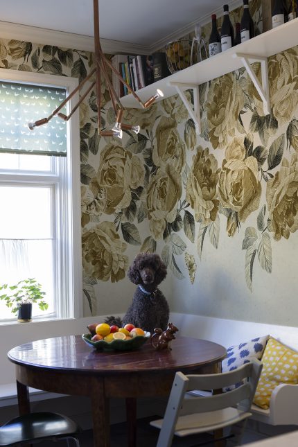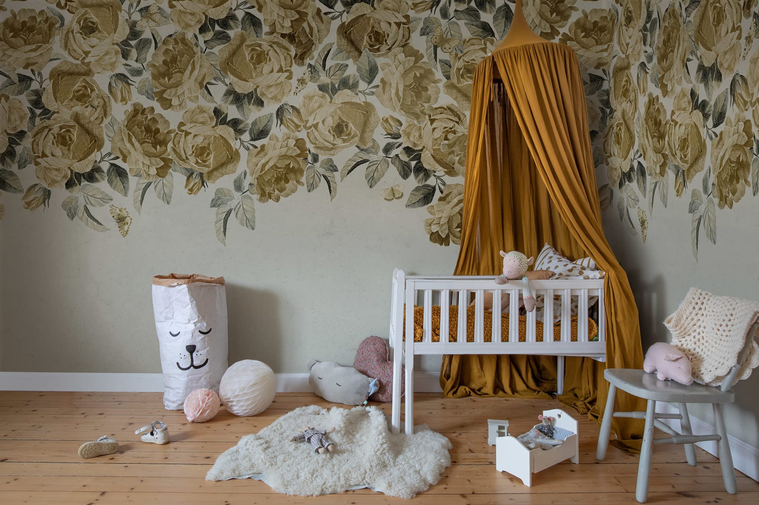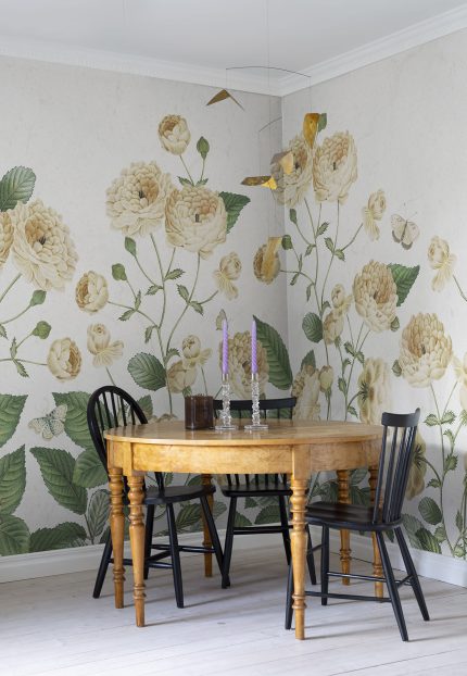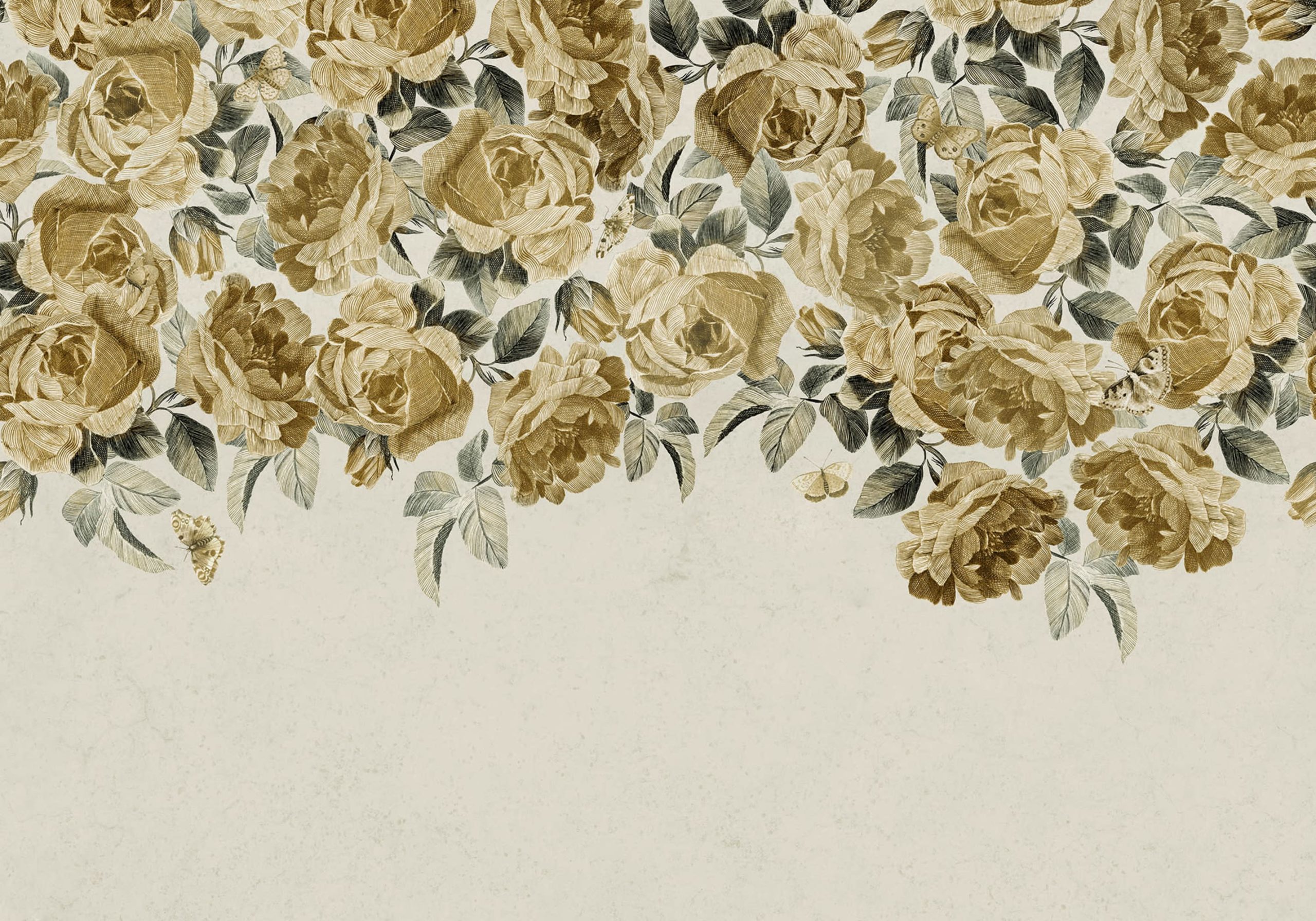 O abundență de trandafiri superbi. Atârnând de tavan sau crescând grațios din podea. Tu decizi, dar este o bijuterie în ambele cazuri! Designul este incredibil de detaliat și are o textură foarte frumoasă. Rose Plenty, Pink, vine în galben vioi și verde pe un fundal de beton bej.