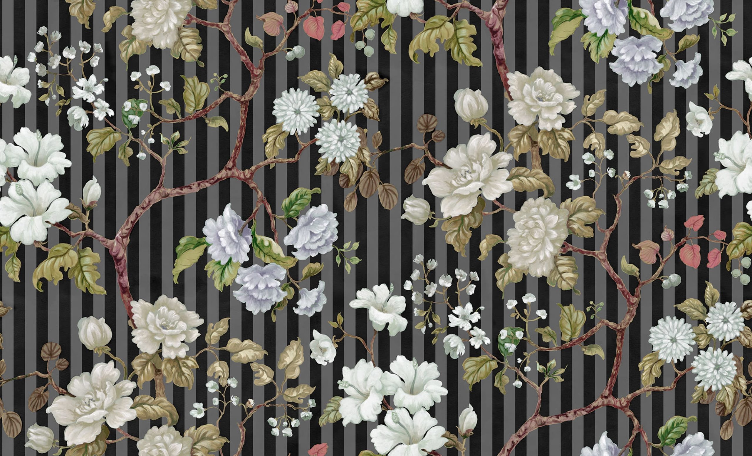 Dungi și crengi întunecate acoperite de flori. O combinație câștigătoare și cu siguranță remarcabilă! Acest model floral la scară mare își revendică spațiul într-un mod cool și romantic. Designul este pictat manual în acuarelă. Varianta Midnight este mai dramatică, cu flori în mare parte albe, contrastante, pe fundalul cu dungi negre și gri.