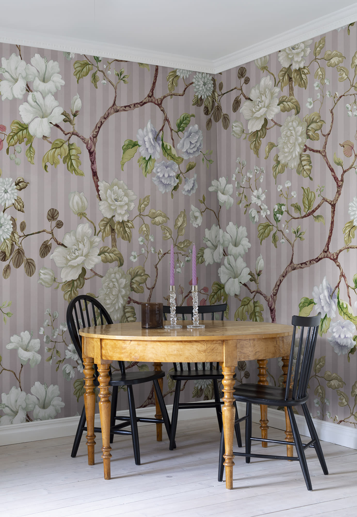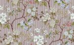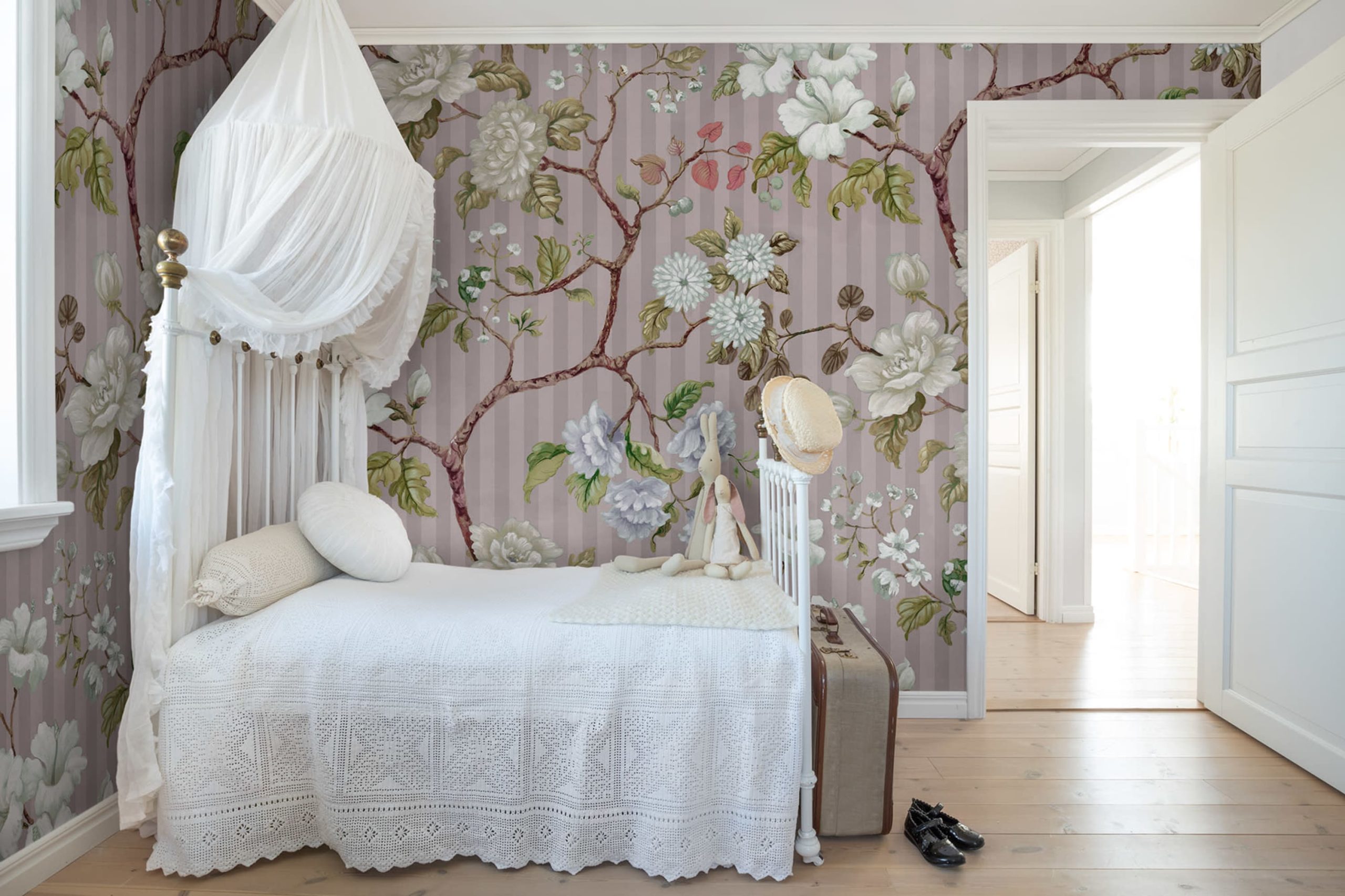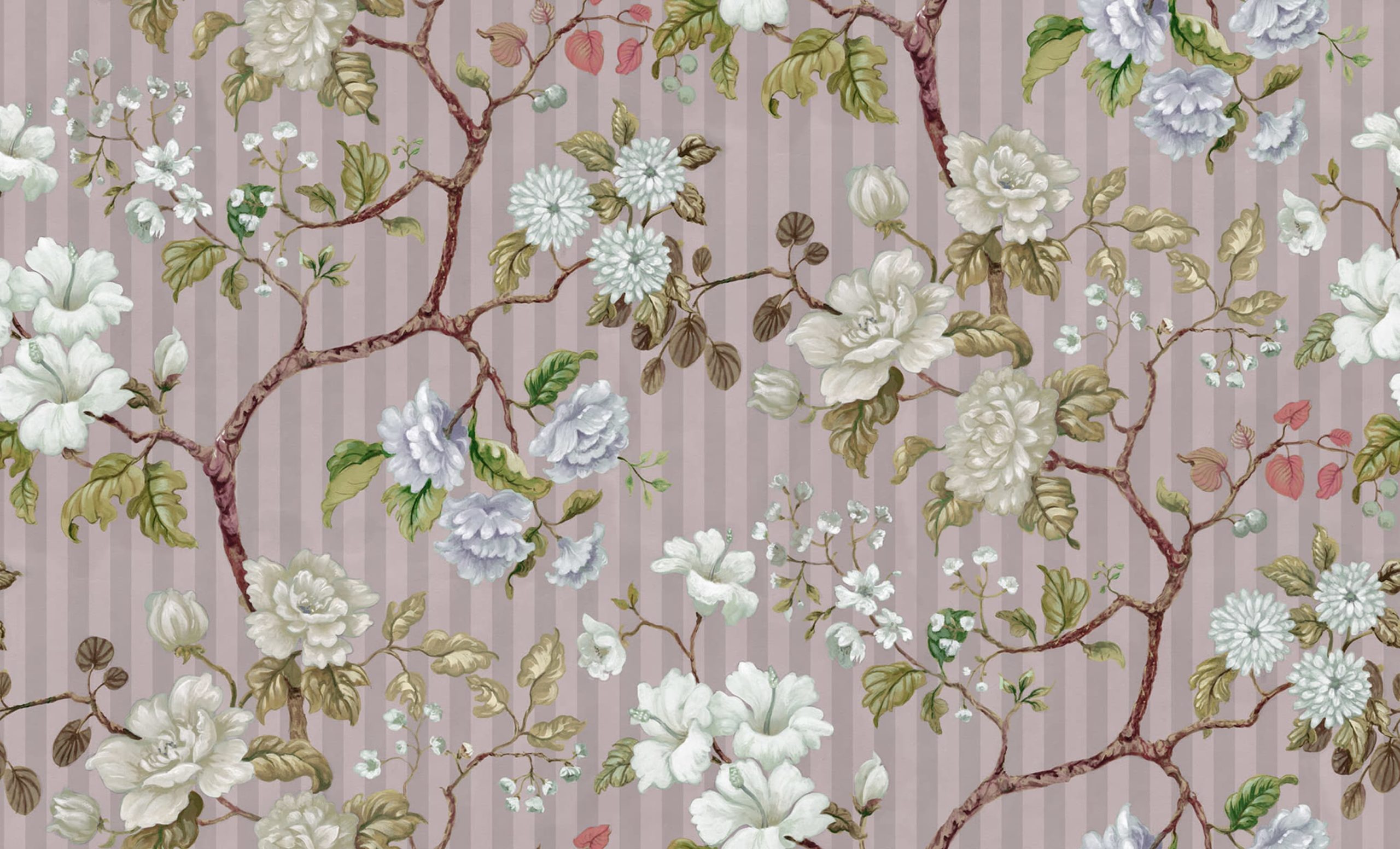 Dungi și crengi întunecate acoperite de flori. O combinație câștigătoare și cu siguranță remarcabilă! Acest model floral la scară mare își revendică spațiul într-un mod cool și romantic. Designul este pictat manual în acuarelă. Varianta Pink prezintă flori în nuanțe frumoase de alb, albastru și verde pe un fundal cu dungi roz.