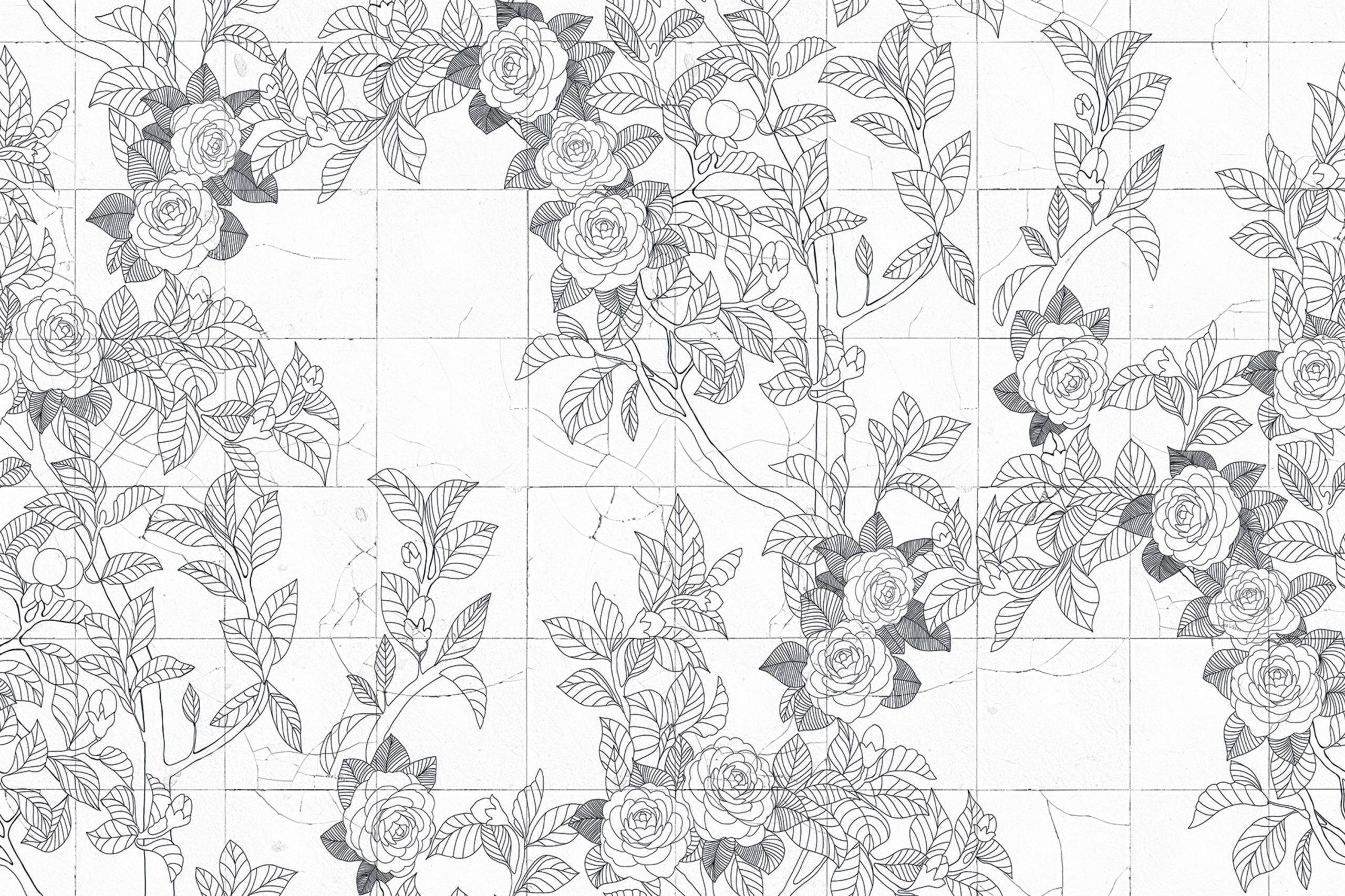 Un model la scară mare al unei fotografii cu plăci ceramice uzate, pictate manual. Placa este uzată, crăpată și foarte detaliată. Designul generos și frumos imperfect atrage cu siguranță atenția. Un must-have cu siguranță într-o bucătărie sau pe hol. Varianta de culori cu faianță albă și trandafiri în grafit oferă un efect foarte artistic și grafic.