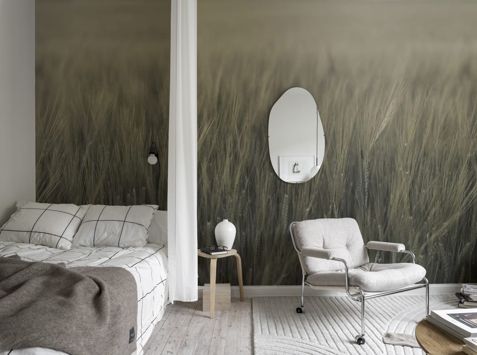 Ai experimentat vreodată senzația de a privi peste câmpurile veșnice în timpul verii? Acest design aduce acel moment magic în spațiul tău. Lumina soarelui diafană și o briză blândă de vară făcute etern în fotografia artistică. Paleta de culori, Green, vine în bej cald și verde închis.