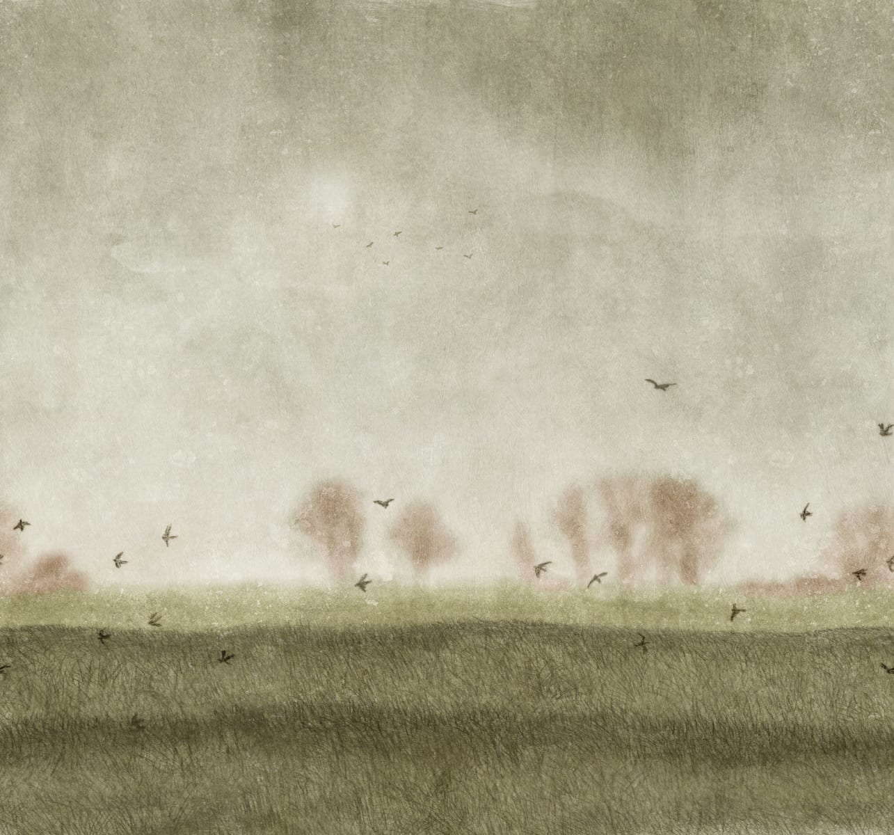 Păsările zboară peste peisajul pustiu în această frumoasă reinterpretare a artei fotografice. Focalizarea moale și tușele texturate aduc o frumusețe picturală scenei, creând un refugiu visător și poetic pentru pereții tăi. Paleta de culori Green vine în nuanțe pământii de verde și maro.