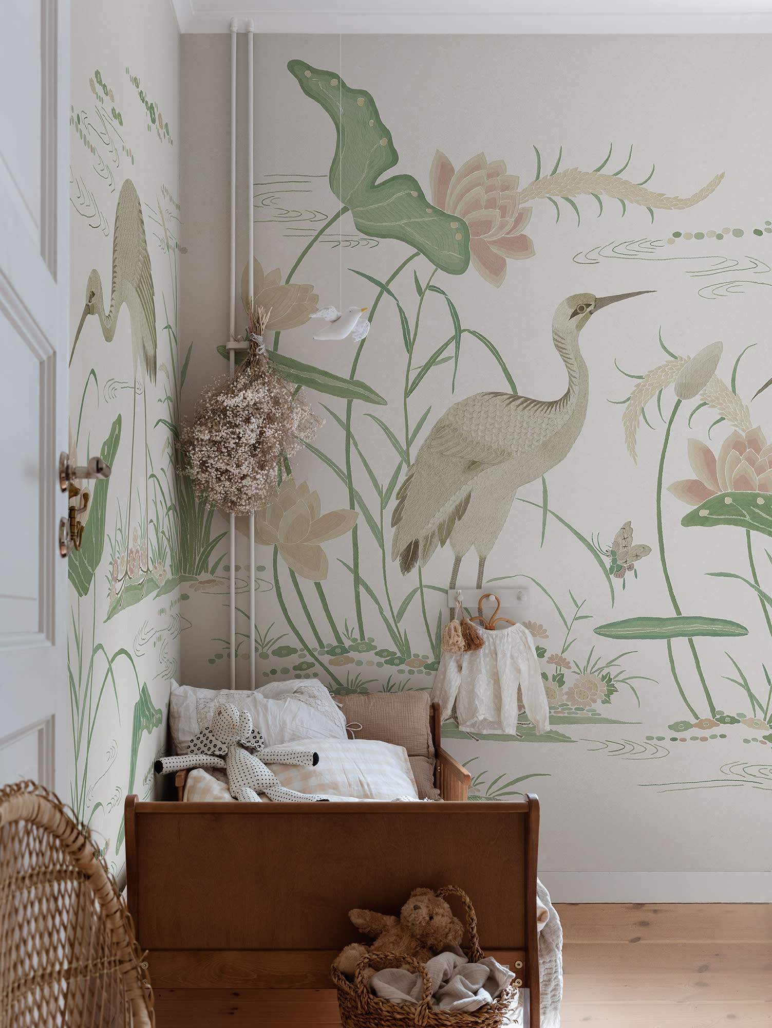 Tapetul Seabirds este un mic paradis pentru păsările de apă care își întind picioarele subțiri între flori de lotus și stuf. Un mural care ocupă spațiu și totuși șoptește în liniște. Designul este inspirat de o frumoasă țesătură chinezească din mătase din secolul al XIX-lea. Culoarea Green are o bază moale și frumoasă de culoare alb închis și un model viu în nuanțe de verde, maro și roz.