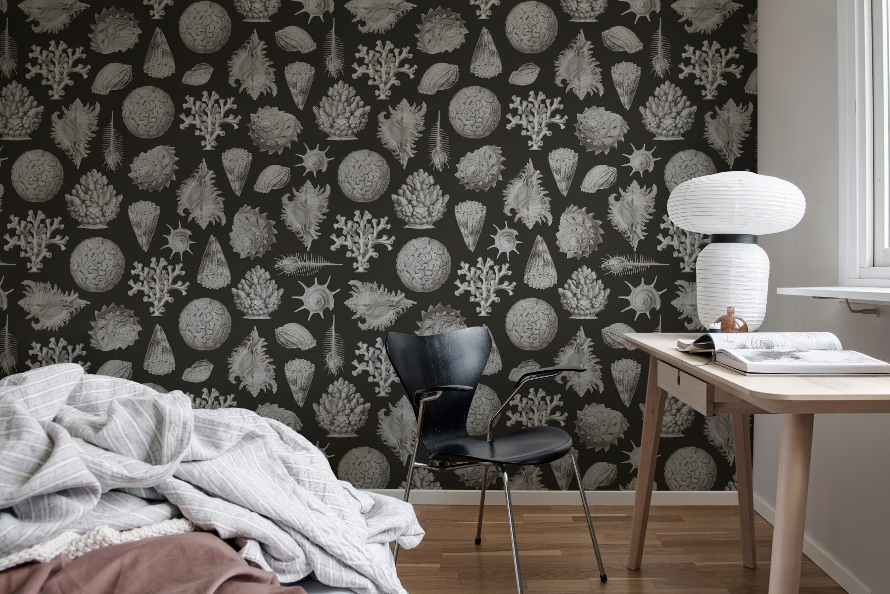 Îmbrățișați alura oceanului cu tapetul nostru Seashells, Graphite. Acest design rafinat surprinde măreția naturală a mării, înfățișând o varietate de scoici contrastate cu un fundal bogat și întunecat. De la spiralele melcilor până la crestele delicate în formă de evantai ale scoicilor, acest design vă invită să explorați frumusețea diversă a vieții marine, chiar în propria casă.